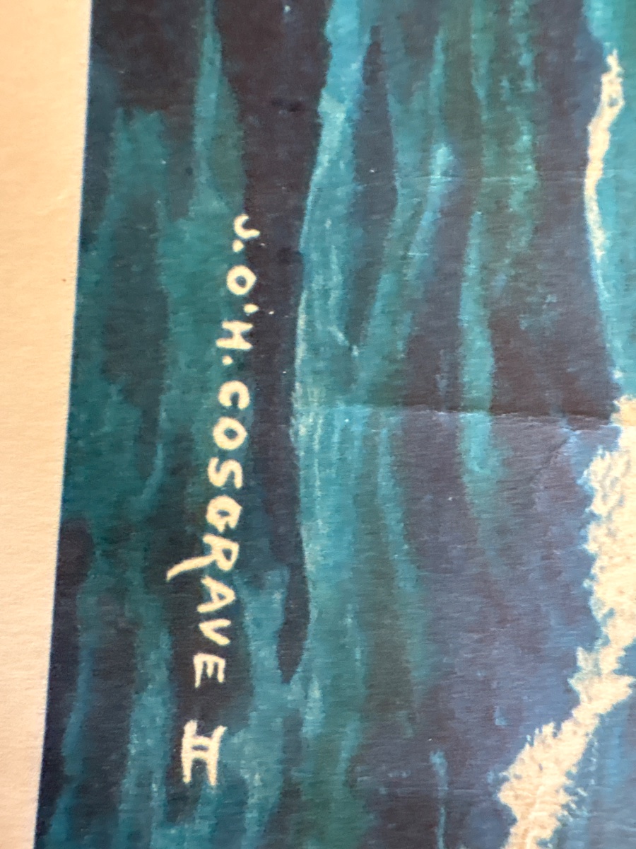 The print shows prominent horizontal and vertical fold lines, which are typical for illustrations originally bound into books. While Cosgrave is a highly respected name, the value of this specific piece is tempered by the visible fold lines and edge damage.