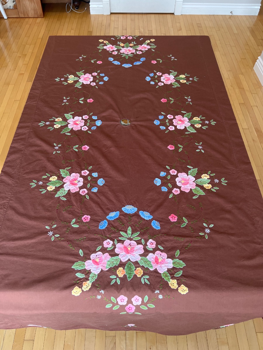 The fabric appears to be in excellent vintage condition with vibrant colors and no visible staining, which is rare for dark linens. Value is driven by the unusual and highly collectible chocolate brown color, the large size, and the presence of the umbrella hole which makes it desirable for…