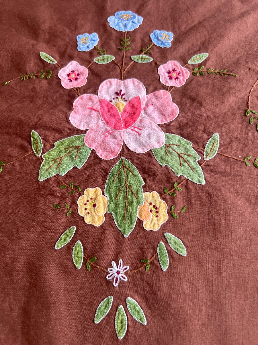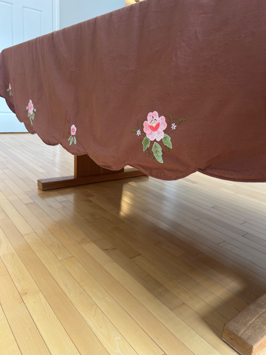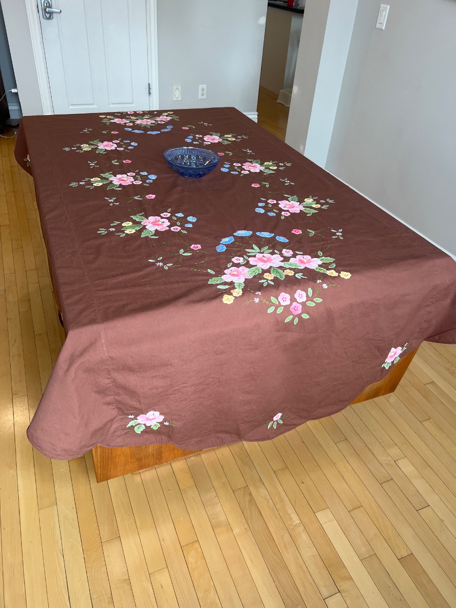 A large-scale chocolate brown linen tablecloth featuring vibrant hand-applied floral motifs and delicate embroidery.