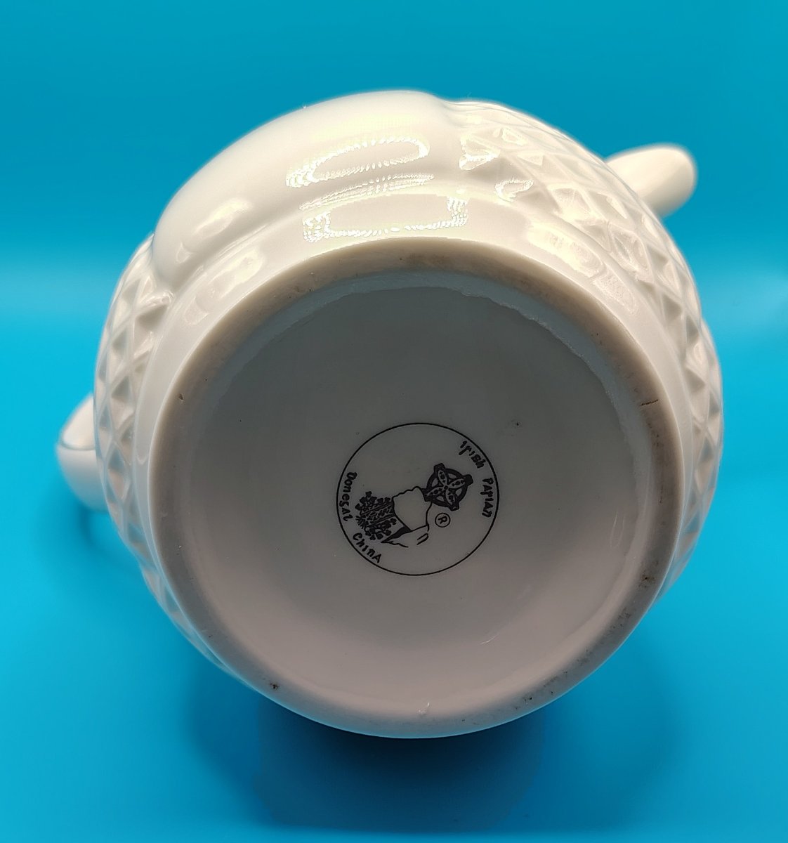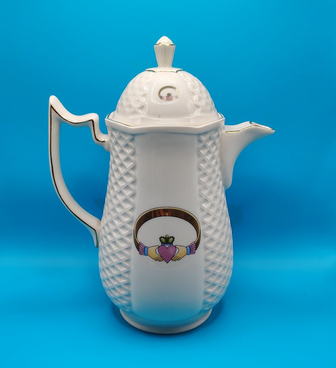 A fine example of Irish Parian ware, this tall coffee pot features a translucent, marble-like finish and a relief-molded diamond lattice pattern.