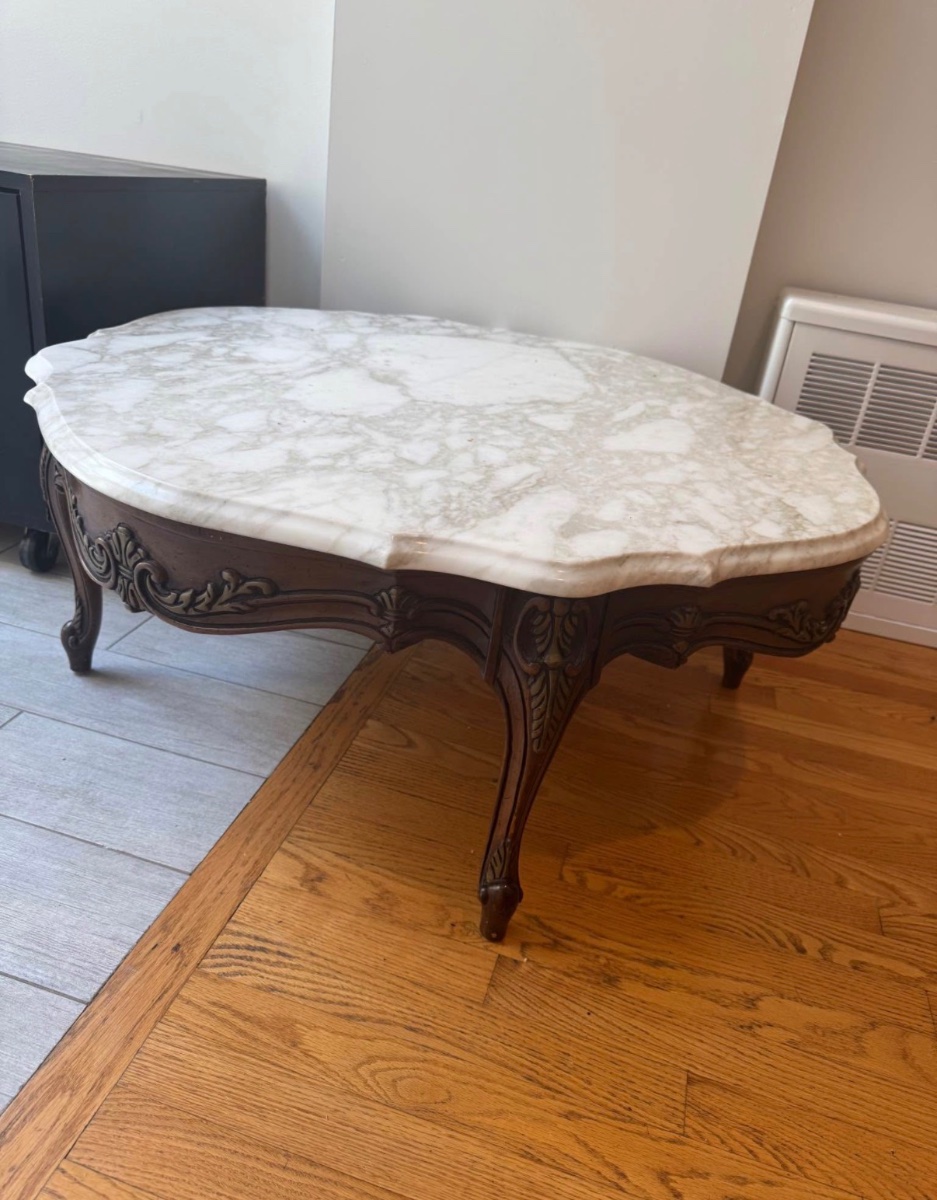 The marble appears to be in excellent condition with a vibrant luster and no visible 'sugar' (crystallization from age) or deep staining. Value is driven primarily by the condition of the marble top; a single crack or deep stain can reduce the value by 50%.