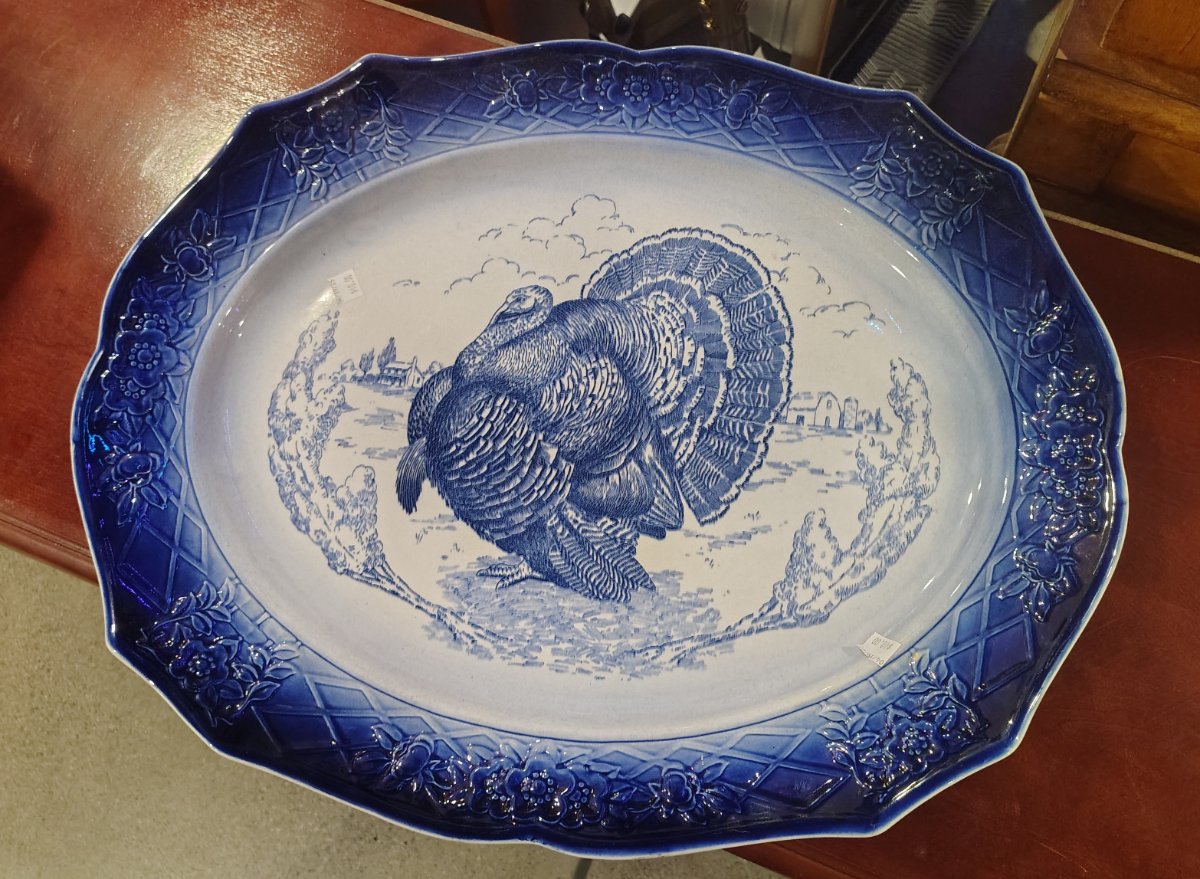 The platter appears to have excellent color saturation and a strong 'flow.' There is no obvious structural damage visible in the photo, though one should check for… Value is driven by the size (oversized platters are more desirable), the intensity of the blue 'flow,' and the popularity of the turkey motif.