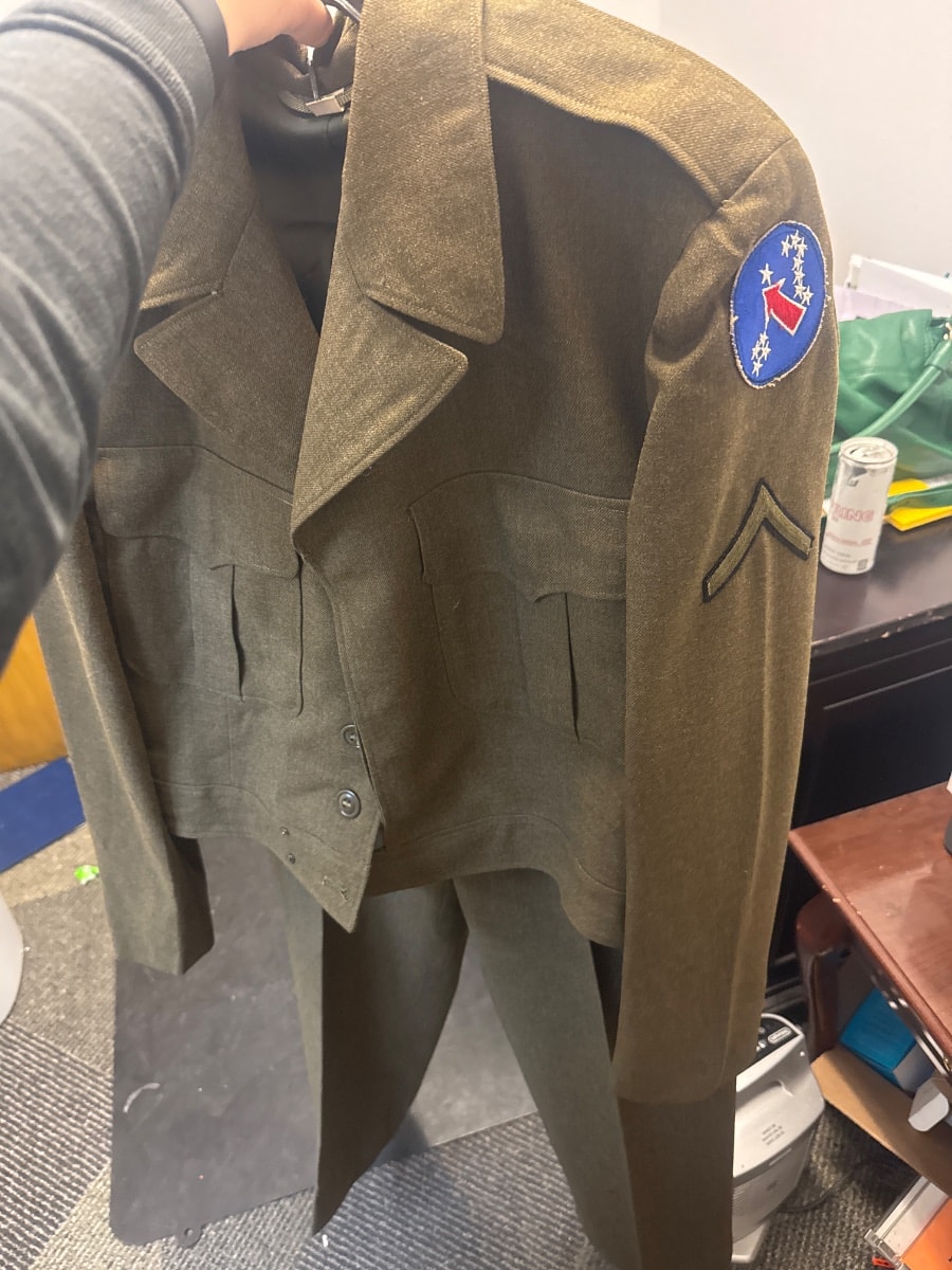 A classic wool serge 'Ike Jacket' uniform set, featuring the insignia of the U.S. Army Forces Western Pacific and the rank of Private First Class.