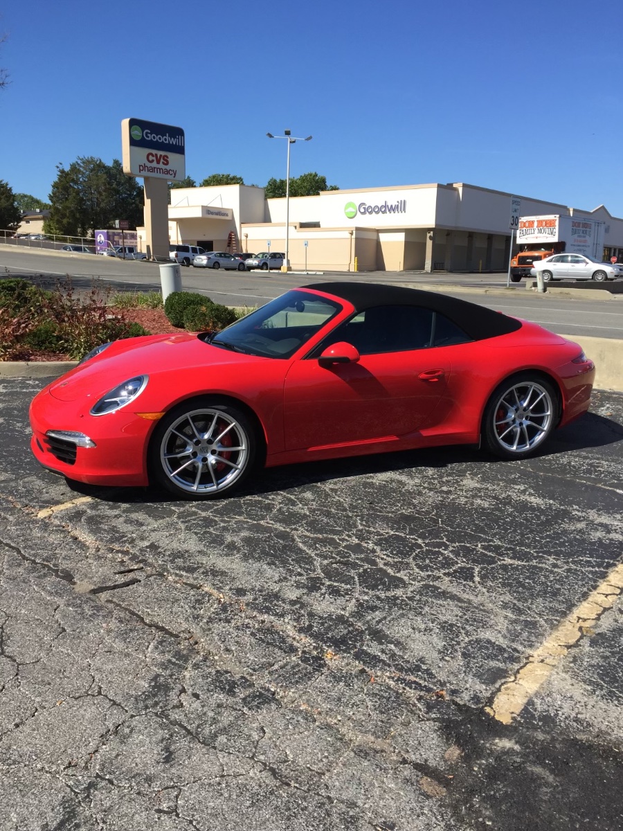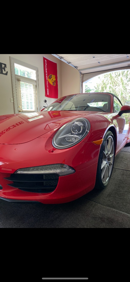 The Guards Red paint appears vibrant and well-maintained, and the soft top shows no obvious signs of fading or typical tension-point wear in the photos. Prices for 991.1 models have remained remarkably resilient because enthusiasts specifically seek out the naturally aspirated 3.8L engine.