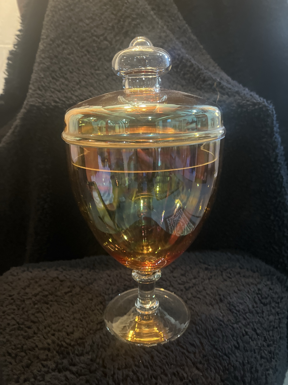 The glass appears clear with a strong, even luster and no visible cracks or heavy scratching. The lid seems to fit snugly, which is vital for value. Value is driven by the presence of the original lid and the vibrancy of the iridescent finish.