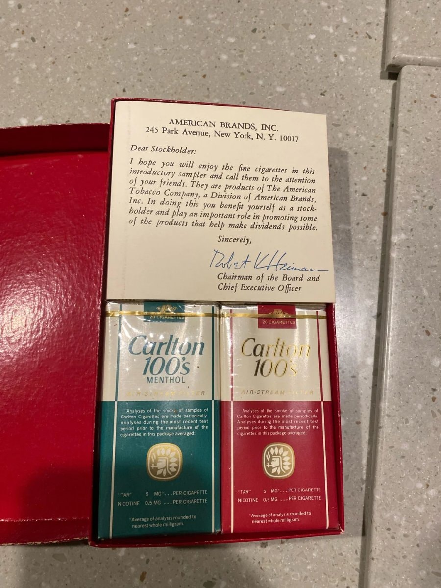 A rare promotional 'dividend' sampler box sent directly to shareholders of American Brands, Inc. (formerly the American Tobacco Company).