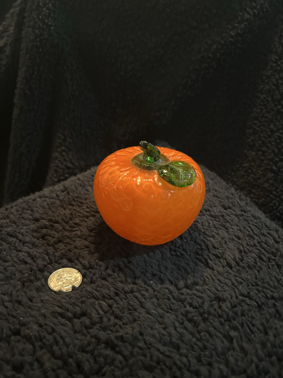 A vibrant example of 'frutta di vetro' (glass fruit), featuring a textured, cased-glass body designed to mimic the zest of a real orange.