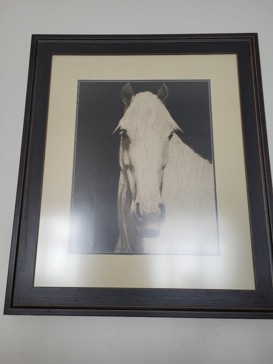 A striking, high-contrast monochromatic print capturing the soulful, frontal gaze of a white horse against a deep black void.