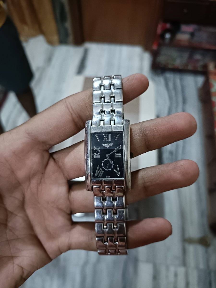 A quintessential example of the Longines DolceVita collection, featuring a rectangular 'tank' style stainless steel case and a striking black dial.