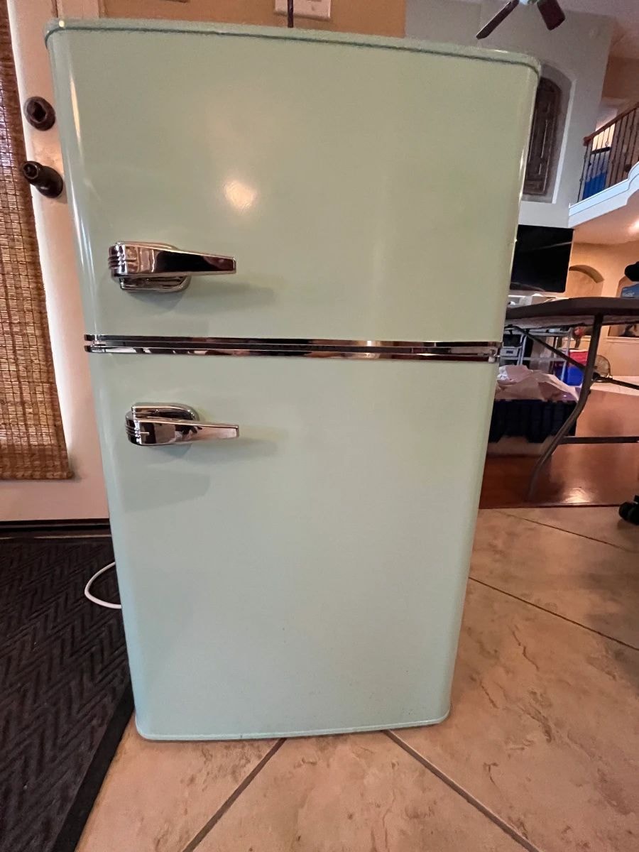A charming two-door compact refrigerator finished in a glossy 'Seafoam Green' with chrome-finished hardware.