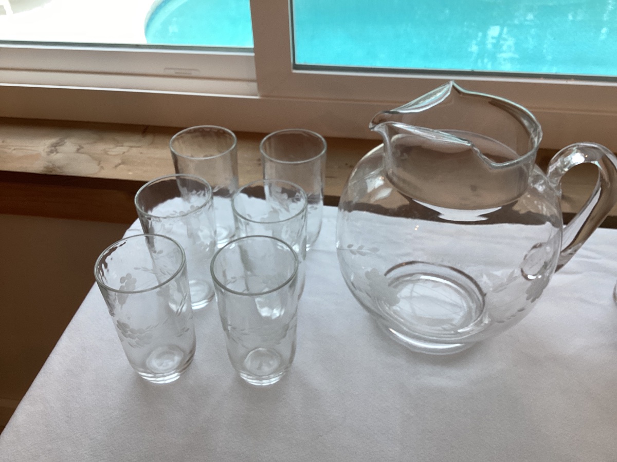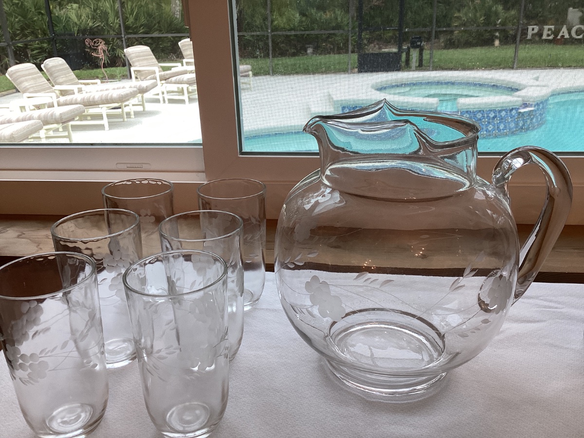 The glass appears remarkably clear in the photos, showing no signs of 'glass sickness' or permanent clouding from dishwasher use. Value is driven by the completeness of the set and the popularity of the 'ball pitcher' form.