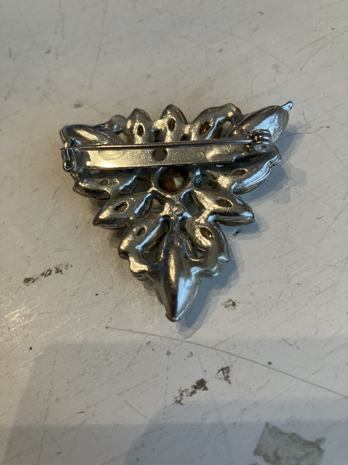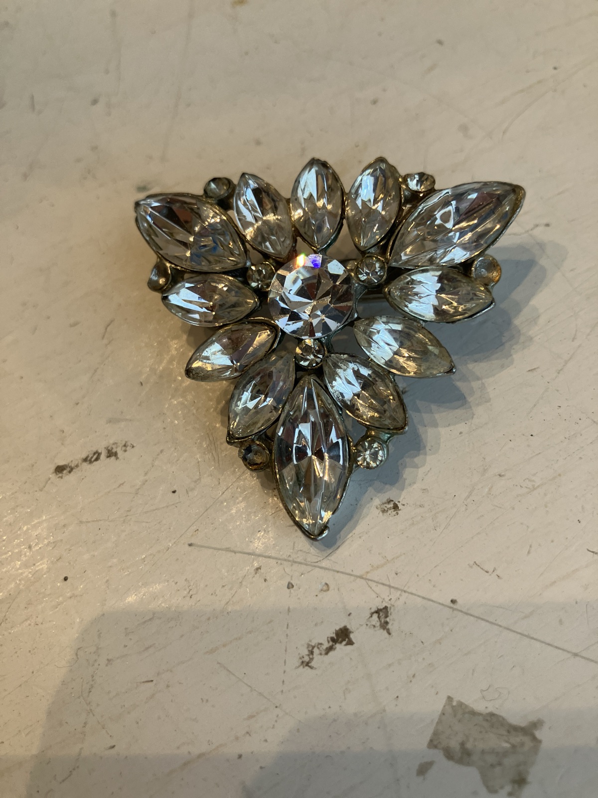 The stones appear remarkably bright with no obvious 'dead' or yellowed rhinestones, which is excellent for its age. Unsigned clear rhinestone pieces are staples of the vintage market; value is driven by the brilliance of the stones and the lack of 'greying' or 'dead' rhinestones.