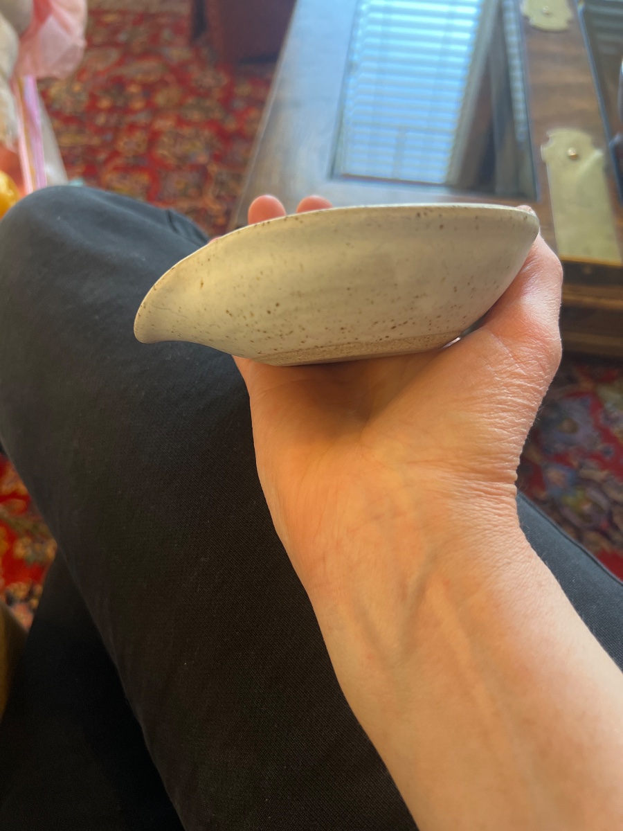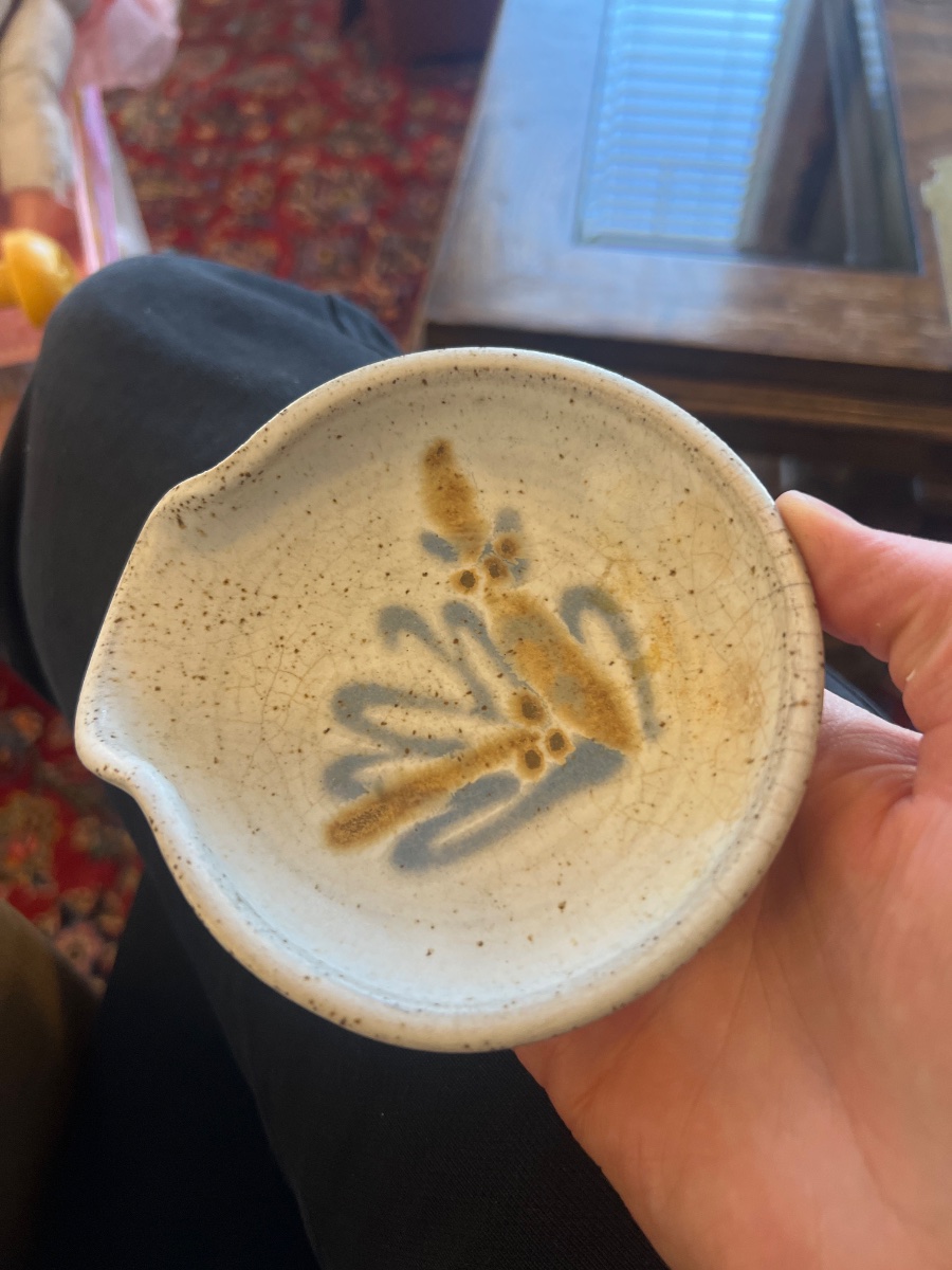 A hand-thrown stoneware spoon rest featuring a speckled 'salt and pepper' glaze and a stylized botanical motif in cobalt blue and iron brown.