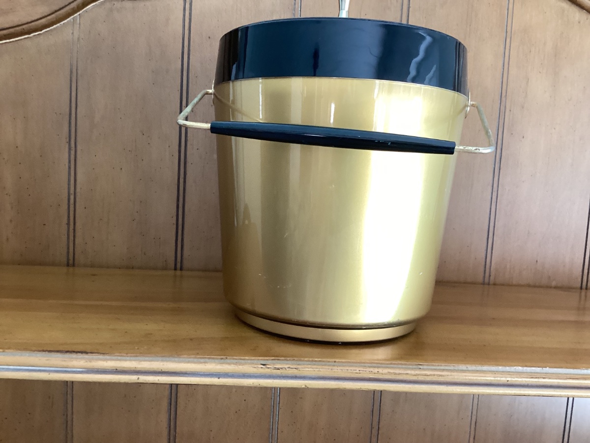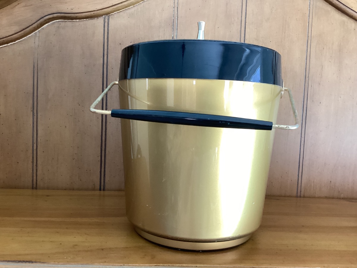 A quintessential piece of 'Mad Men' era barware, this insulated ice bucket features a striking gold-anodized aluminum body paired with a sleek jet-black lid and handle.