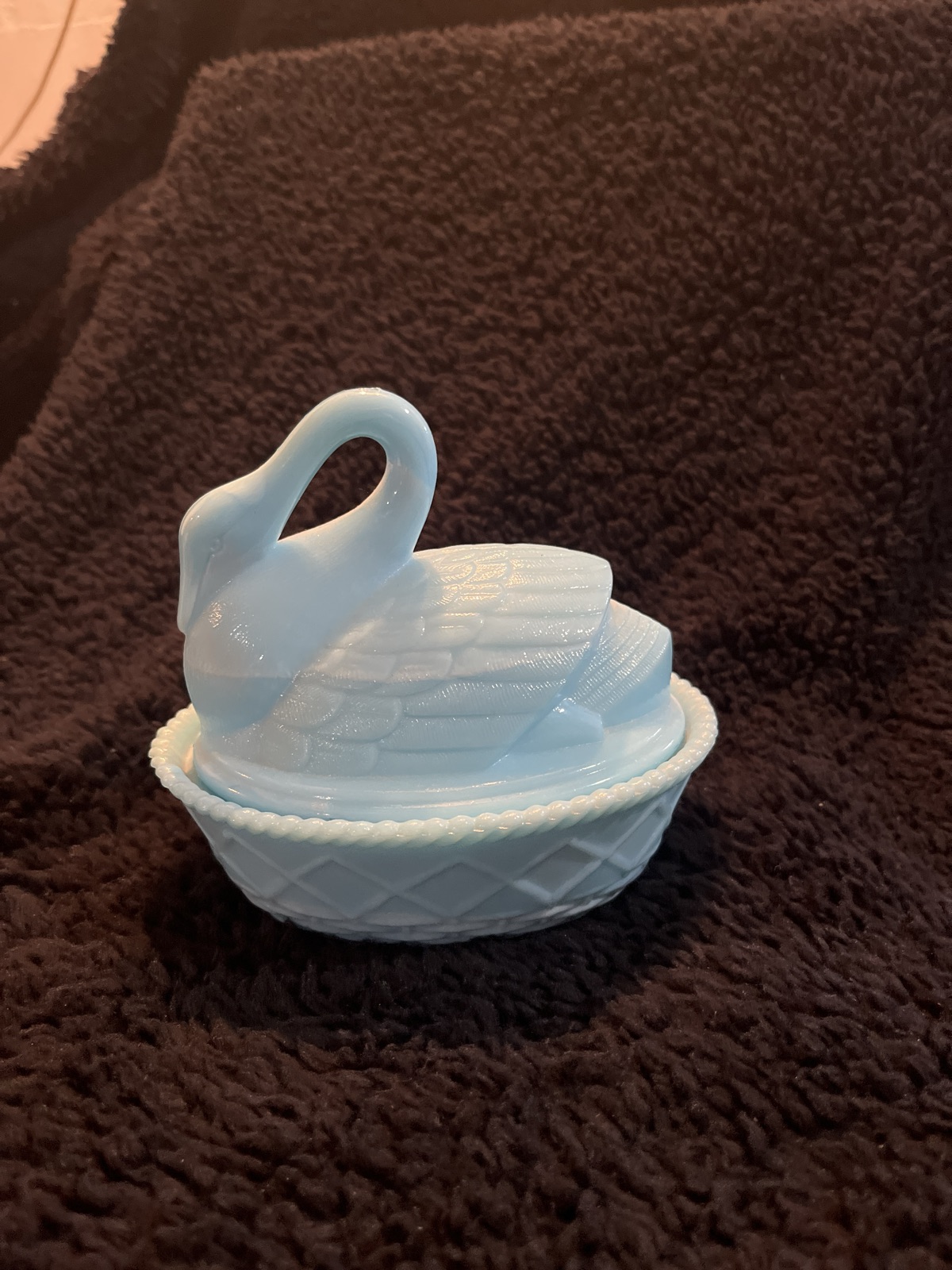 Based on the photo, the piece appears to be in excellent vintage condition with no visible chips to the delicate beak or the scalloped 'beaded' edge. While these were produced in significant quantities, the blue milk glass variety is more sought after by collectors than the standard white.