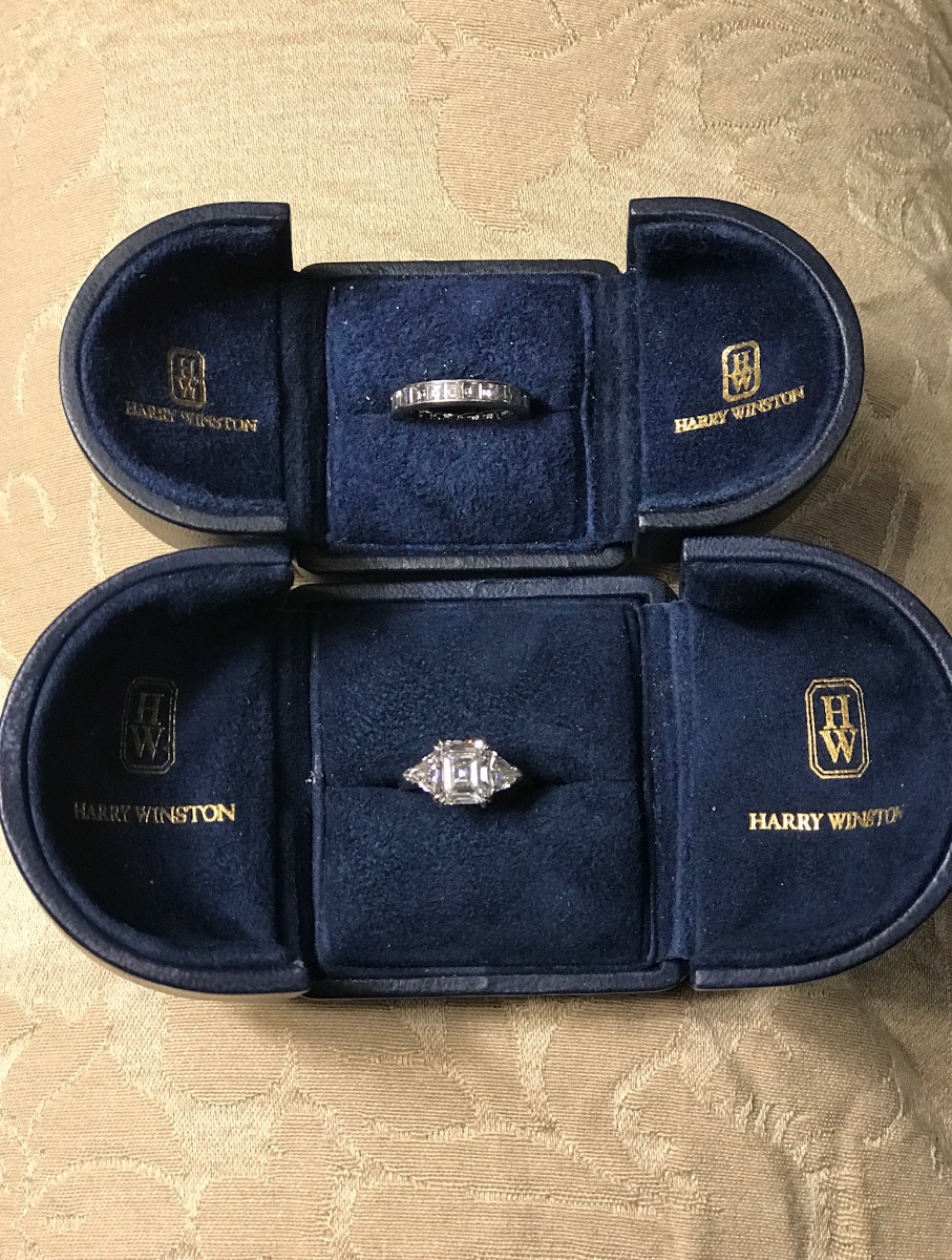 The pieces appear to be in excellent condition and are housed in their original signature navy blue velvet-lined boxes. Value is heavily dictated by the '4 Cs' of the center stone (Carat, Color, Clarity, Cut) and the presence of original GIA certification.