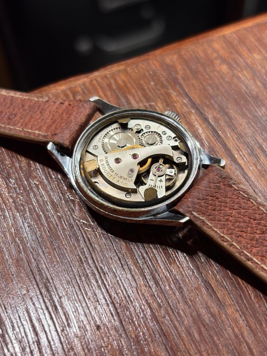The dial shows a pleasing 'stardust' patina, which are tiny age spots that collectors often prefer over a modern restoration. Value is driven by the clean dial and the reputable S. Kocher movement.