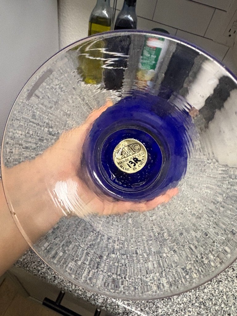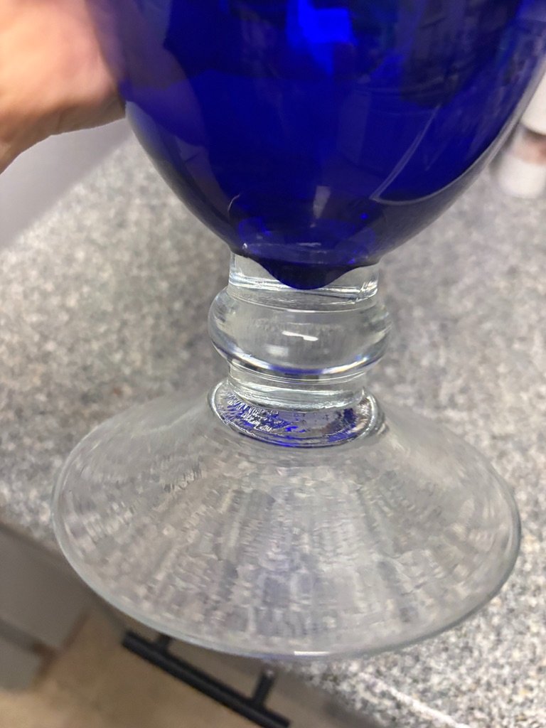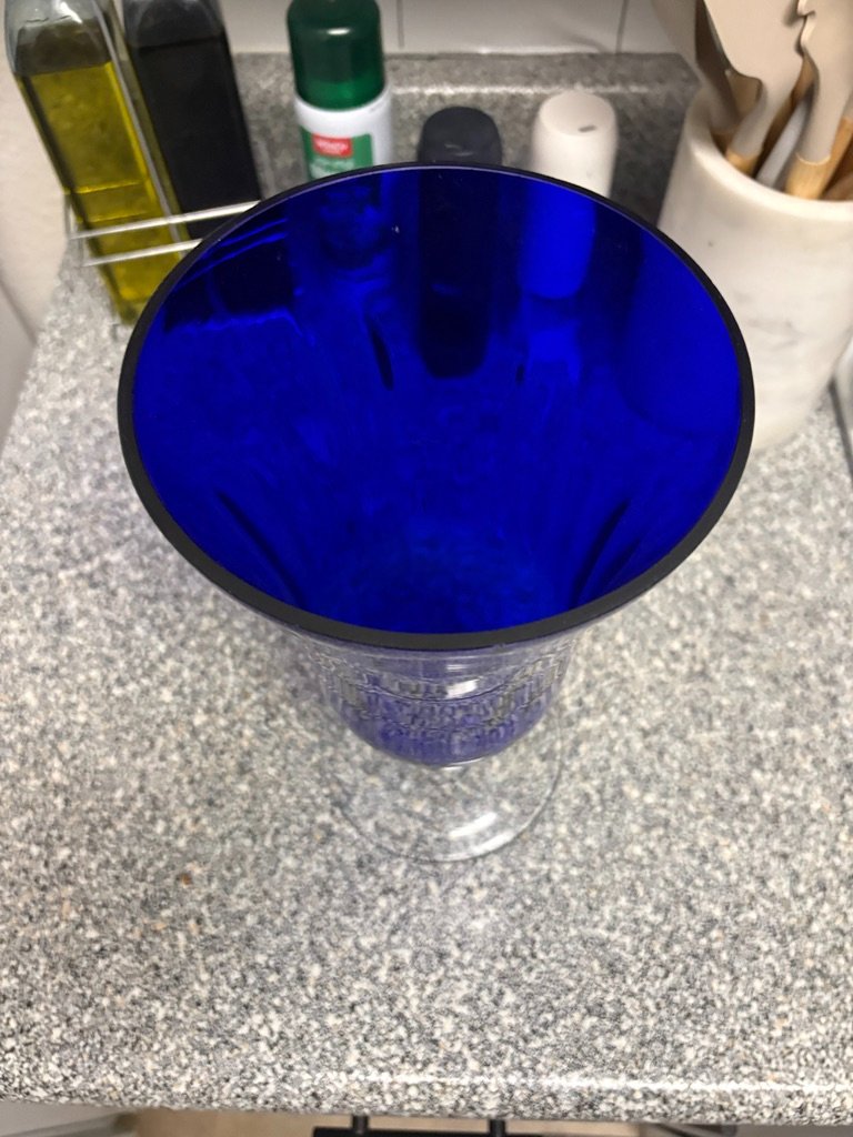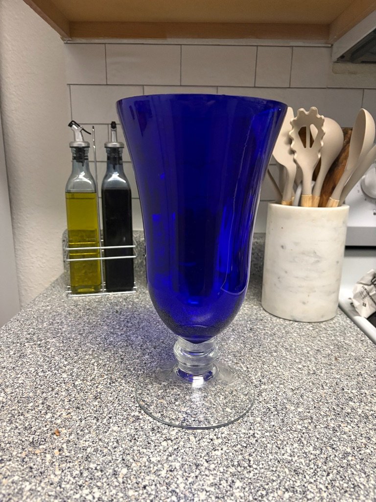 The glass appears to be in excellent structural condition with no visible chips or 'flea bites' on the rim. While mass-imported, handcrafted cobalt glass maintains a steady secondary market demand because the color is perennially popular for home staging and decor.