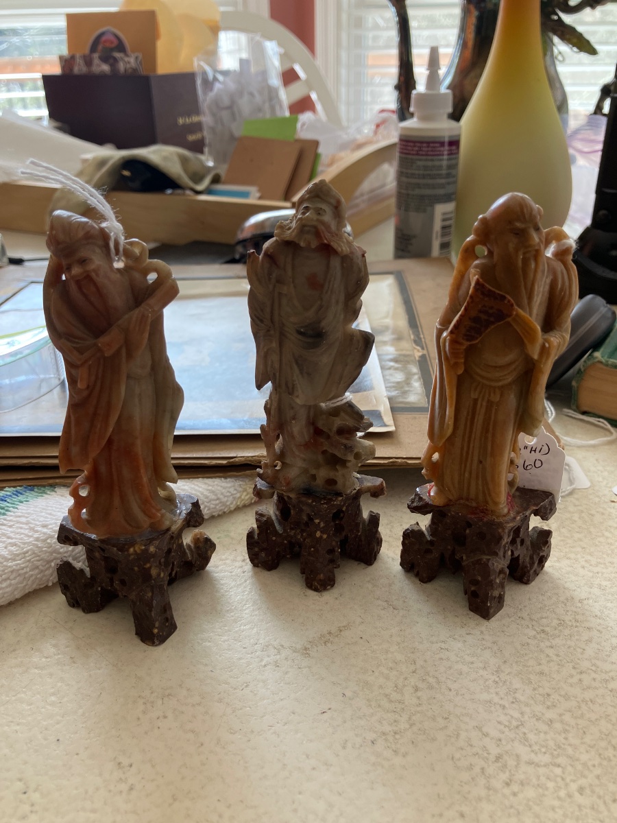 A complete set of three hand-carved soapstone figures representing the 'Sanxing' or Three Star Gods: Fu, Lu, and Shou.