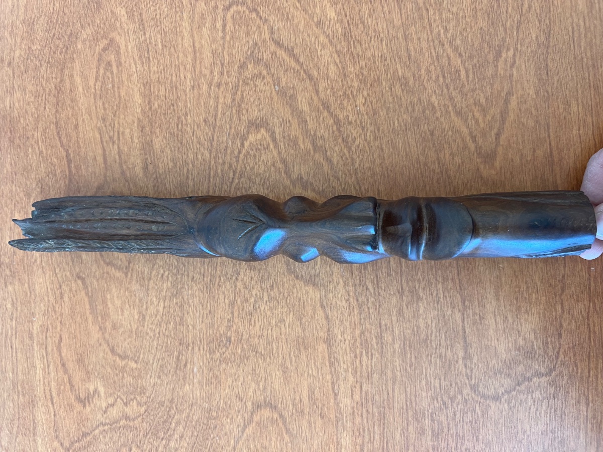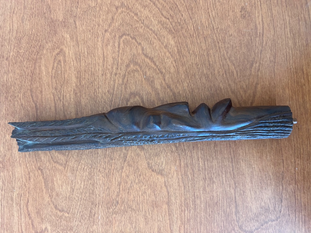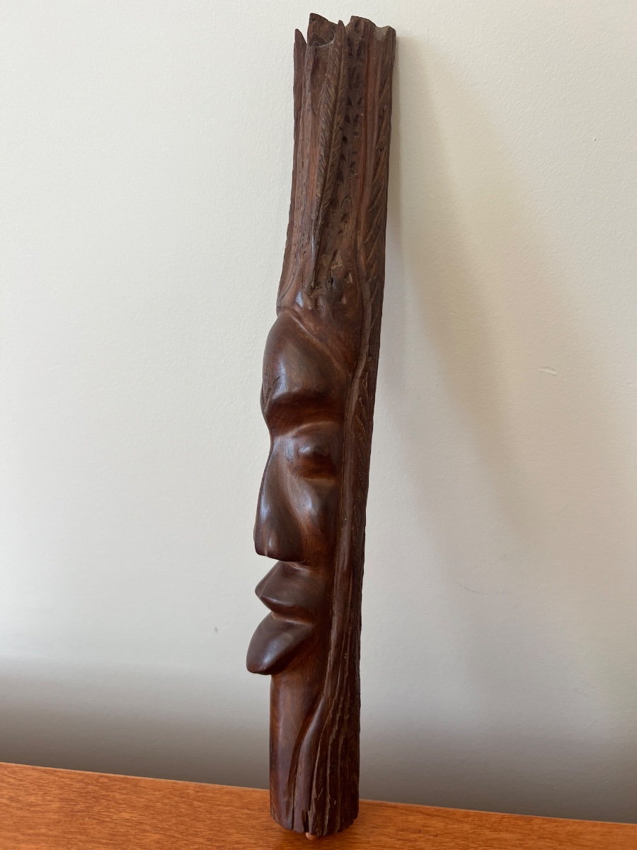 A hand-carved hardwood sculpture, likely African Ebony, featuring an elongated stylized face emerging from a textured, organic form.