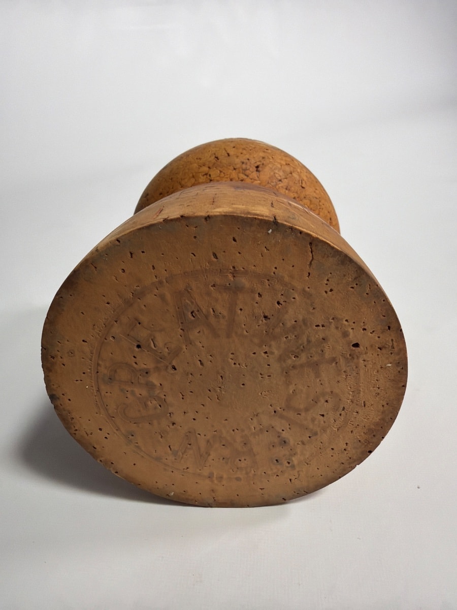 The cork shows typical age-related pitting and some minor darkening, which is common for this organic material. The branding on the base is partially faded but remains legible, which is crucial for its value. Overall, it has a lovely 'patina' that proves its vintage status. Excellent condition for cork, which is prone to chipping.