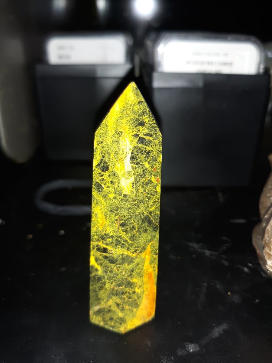A striking, tower-shaped polished point carved from Bumblebee Jasper, a rare volcanic material known for its vibrant 'caution' colors.