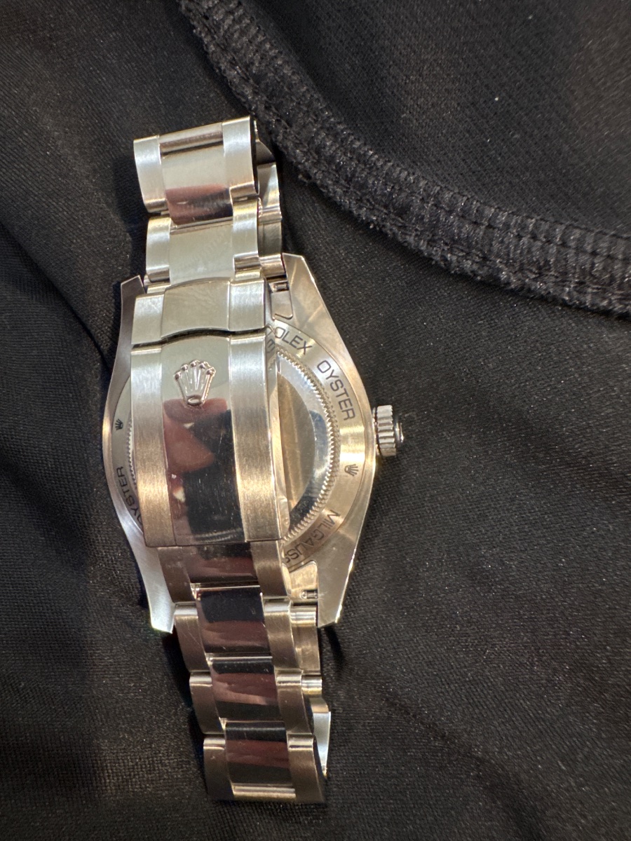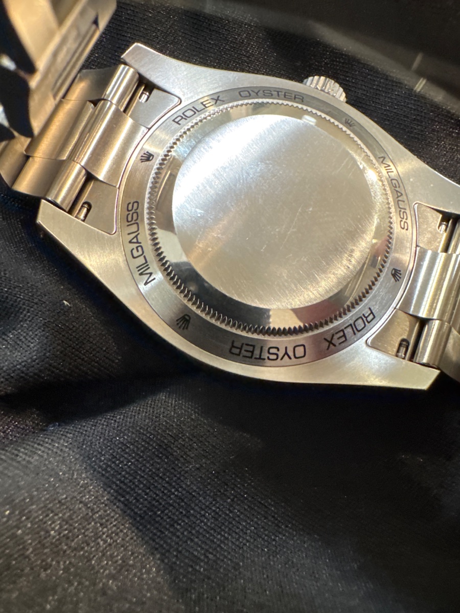 The watch appears to be in good, honest condition with visible surface scratches on the polished center links of the bracelet and the smooth bezel, consistent with… The white dial Milgauss was discontinued around 2014, making it rarer than the black dial version.