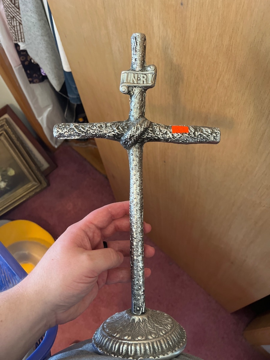 The piece appears structurally sound with a well-preserved patina. The orange price sticker should be removed with care using a mild adhesive remover to avoid stripping the 'antique' wash from the metal. Minor surface wear is consistent with age and actually enhances the rustic aesthetic. Excellent condition overall.