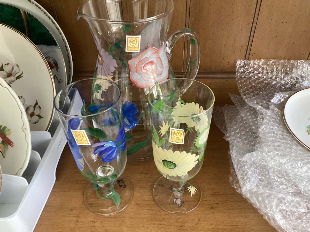 A vibrant set of hand-decorated glassware featuring thick, impasto-style floral enameling on clear glass. This set includes a large serving pitcher and two footed tumblers, each adorned with unique botanical motifs like roses and daisies.