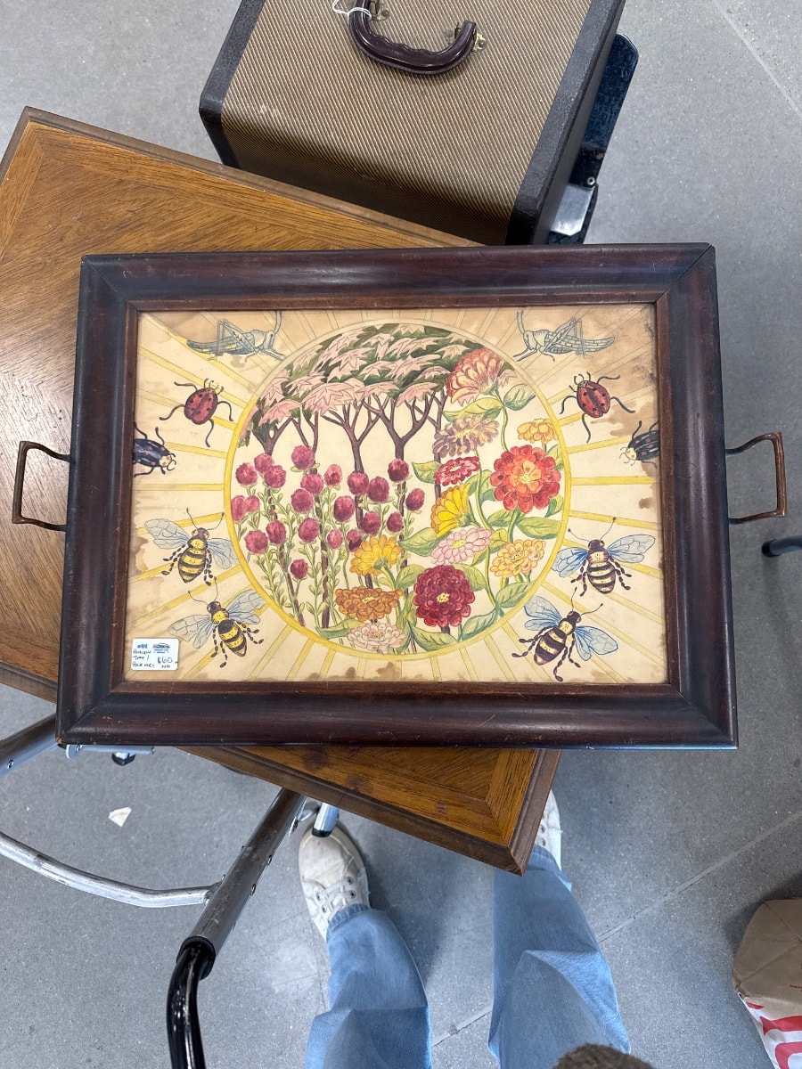 A charming wooden serving tray featuring a vibrant lithographic print of a garden scene protected under glass. The artwork depicts a central floral medallion surrounded by radiating sunbeams and a whimsical…