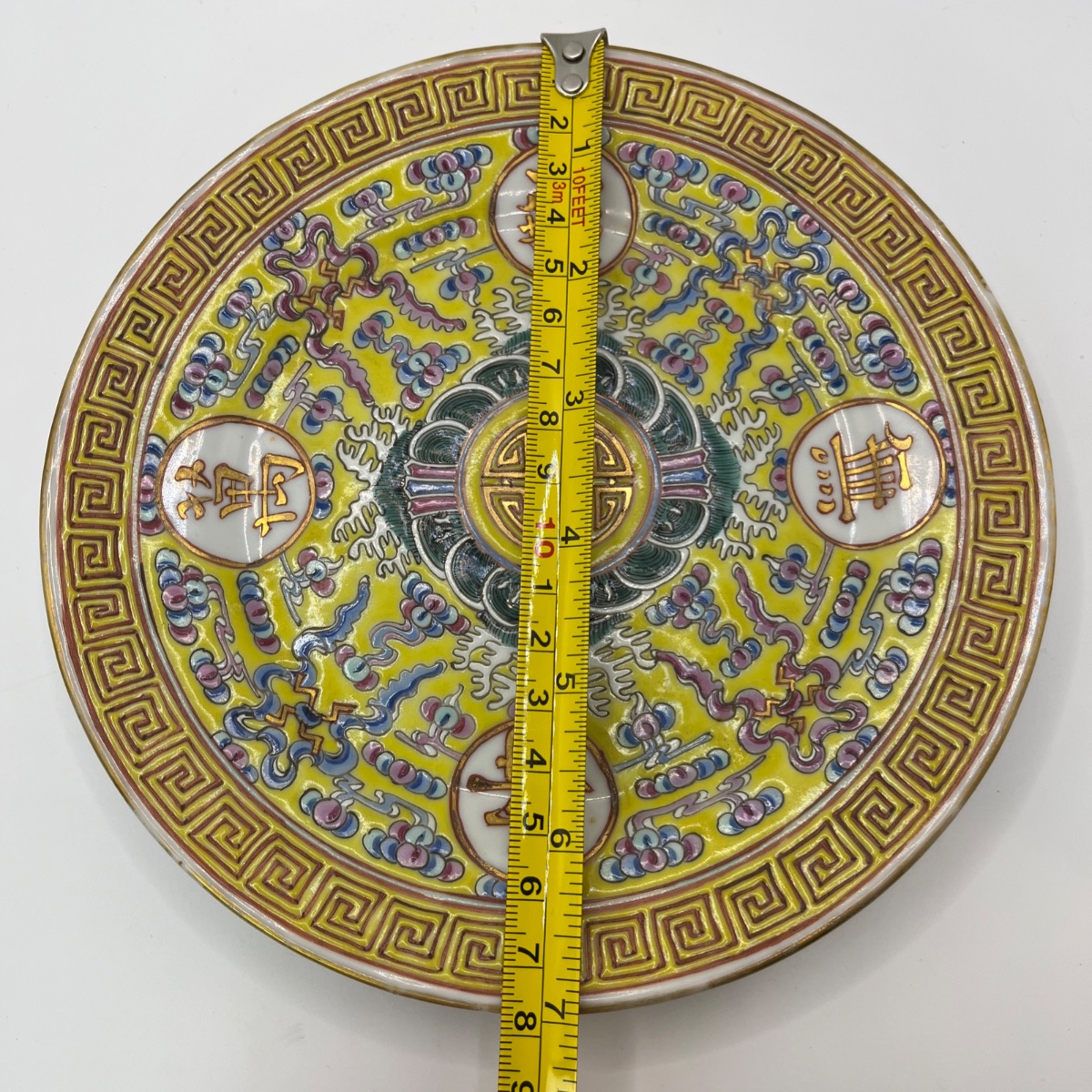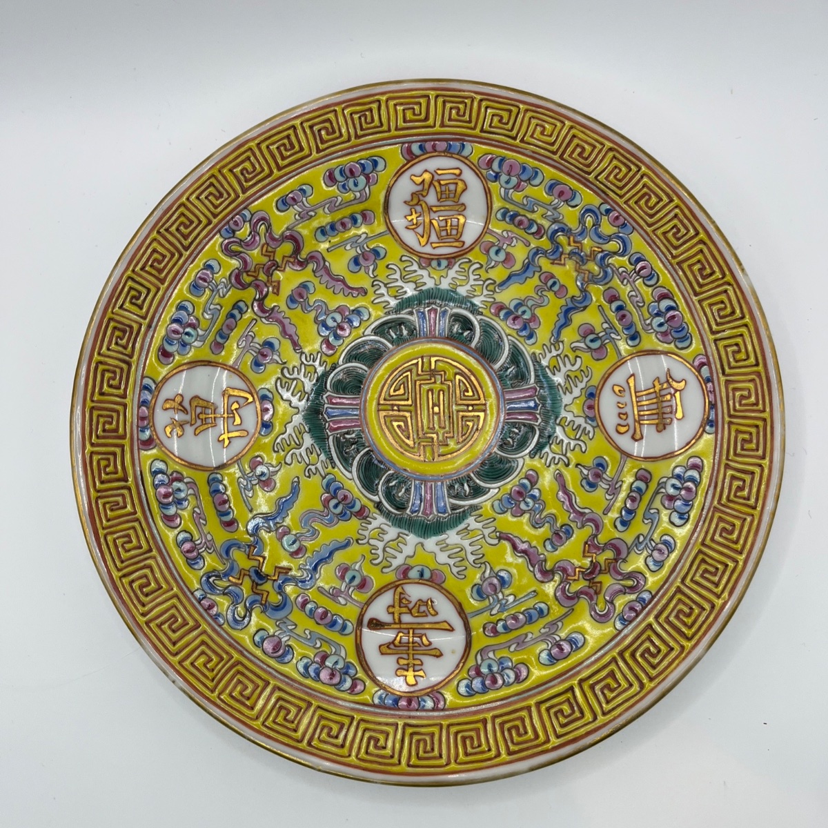 A vibrant imperial-style yellow-ground porcelain plate featuring the 'Wan Shou Wu Jiang' birthday greeting.