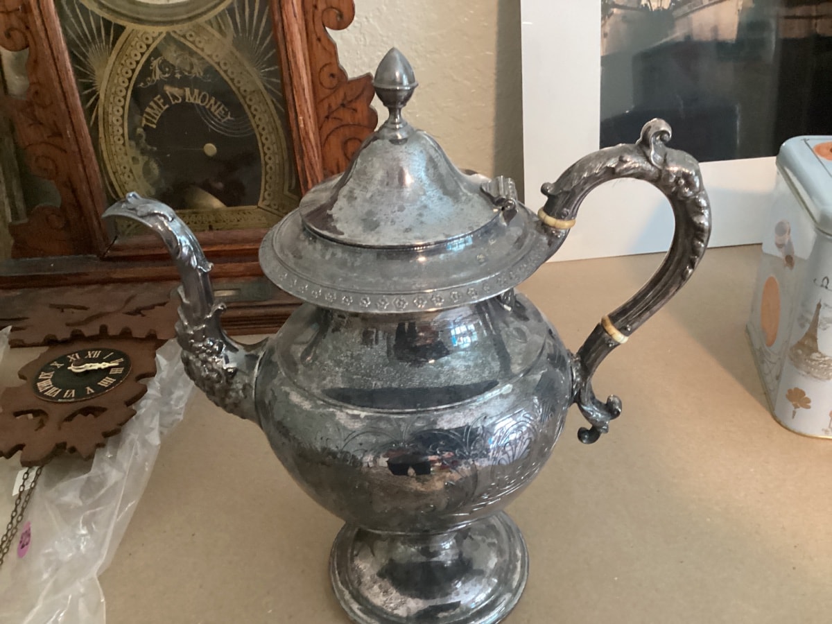 The teapot shows significant surface tarnish and oxidation, which is expected for its age. There appears to be some 'bleeding' where the silver plating has worn thin to reveal the base metal underneath, particularly on the high points of the engraving. This wear reduces the value but adds a sense of authentic history.