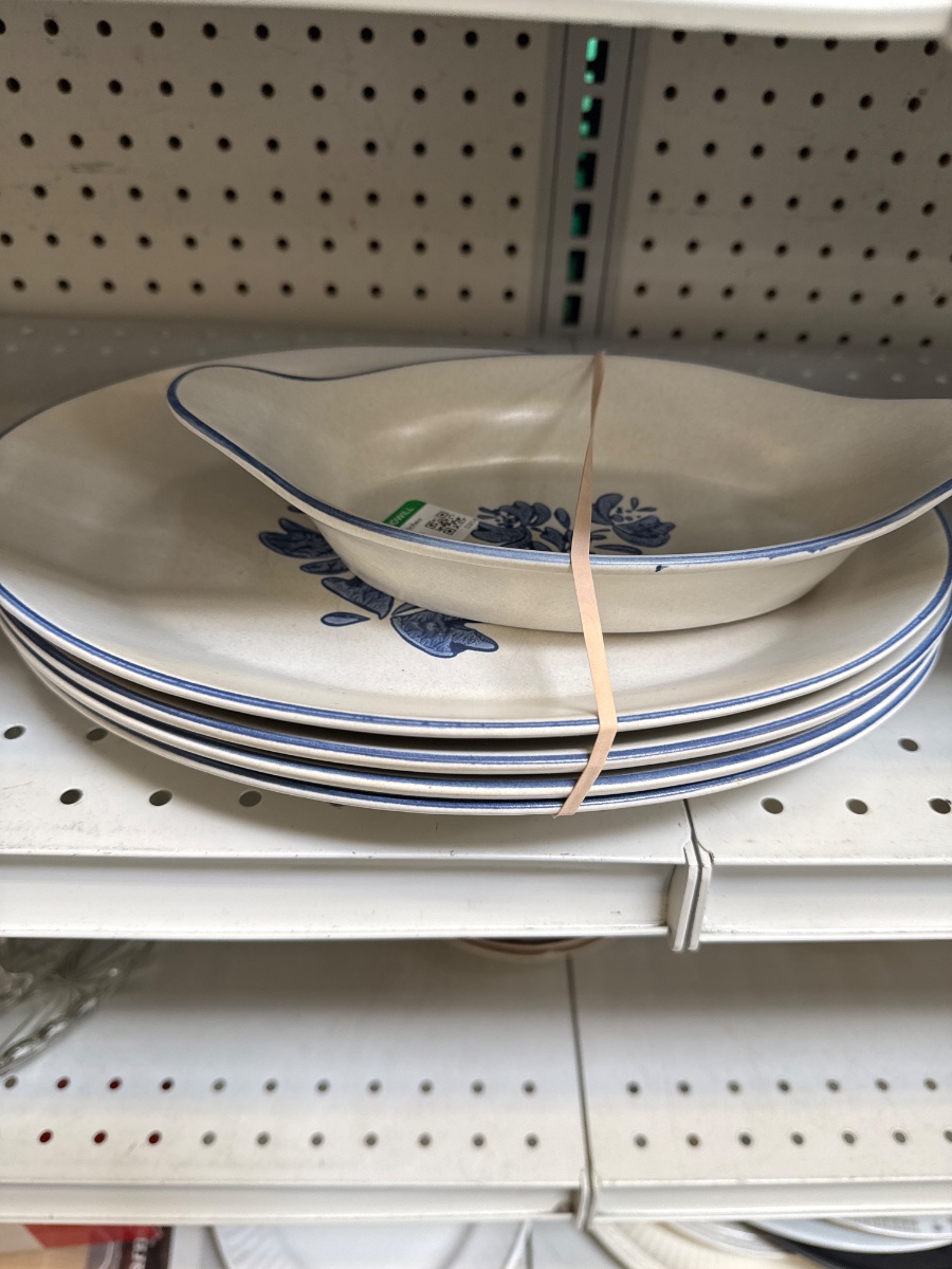 The photos show visible wear and thinning of the blue glaze along the rim of the top serving dish, which is typical for pieces that have seen heavy use. While Pfaltzgraff is iconic, the market is currently well-supplied with 1980s stoneware.