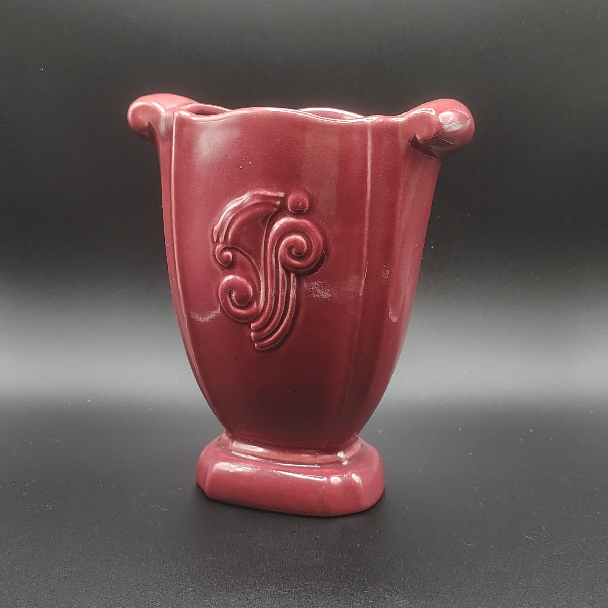 This striking burgundy vase is a classic example of American Art Pottery, featuring a flared rim with scrolled handles and a stylized 'S' relief motif.