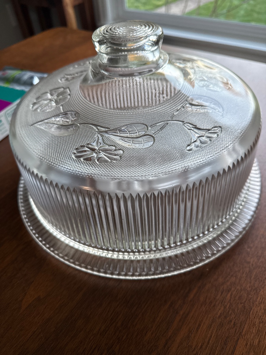 A classic piece of American pressed glass featuring a domed cover with a fluted skirt and a delicate floral spray against a stippled background.