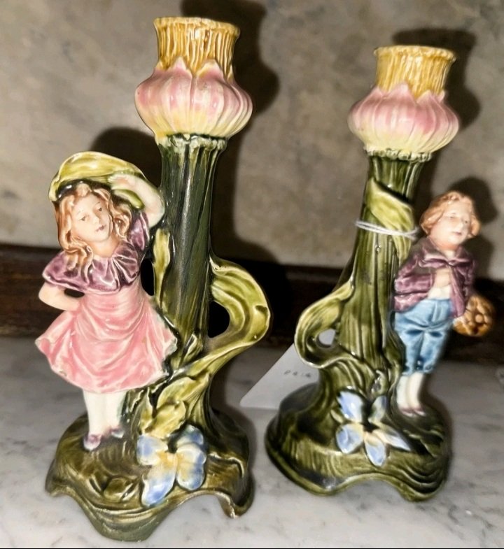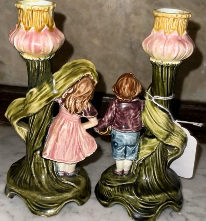 A charming pair of earthenware candlesticks featuring a young boy and girl nestled against stylized, organic floral stems.