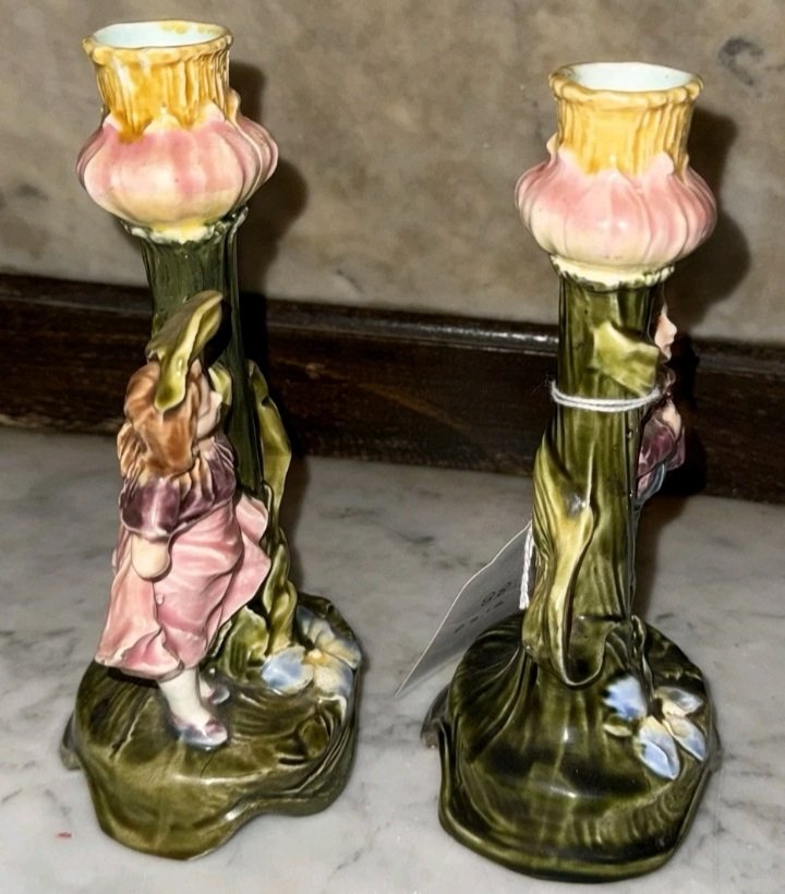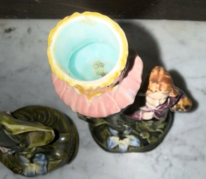 The pieces appear to be in good vintage condition with the expected fine 'crazing' (tiny cracks in the glaze) which is standard for Majolica of this age. Value is driven by the fact that they are a complete, matching pair (boy and girl) in a desirable figural form.