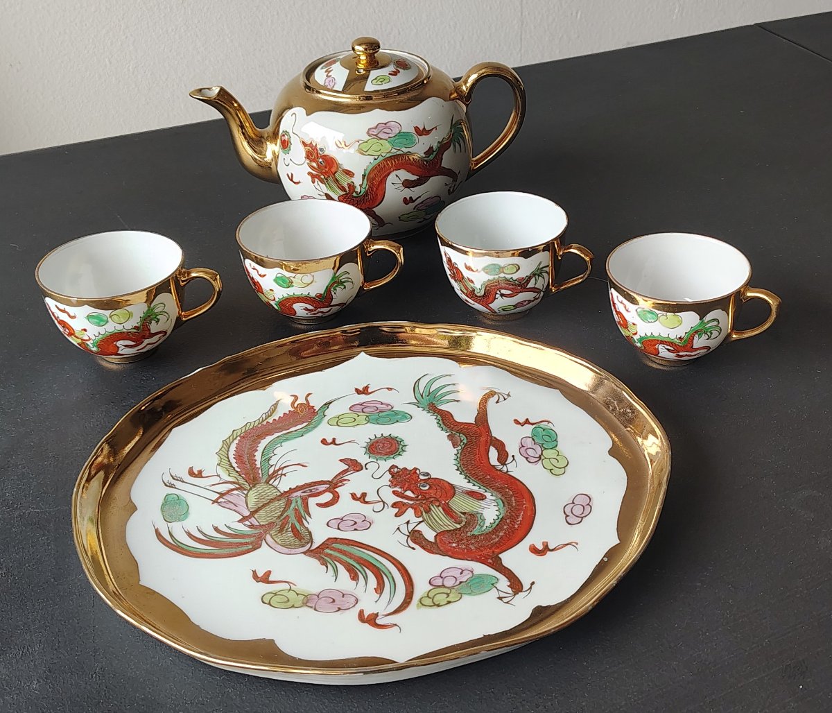 A striking porcelain tea service featuring the 'Dragon and Phoenix' motif, heavily embellished with brilliant gold gilding.