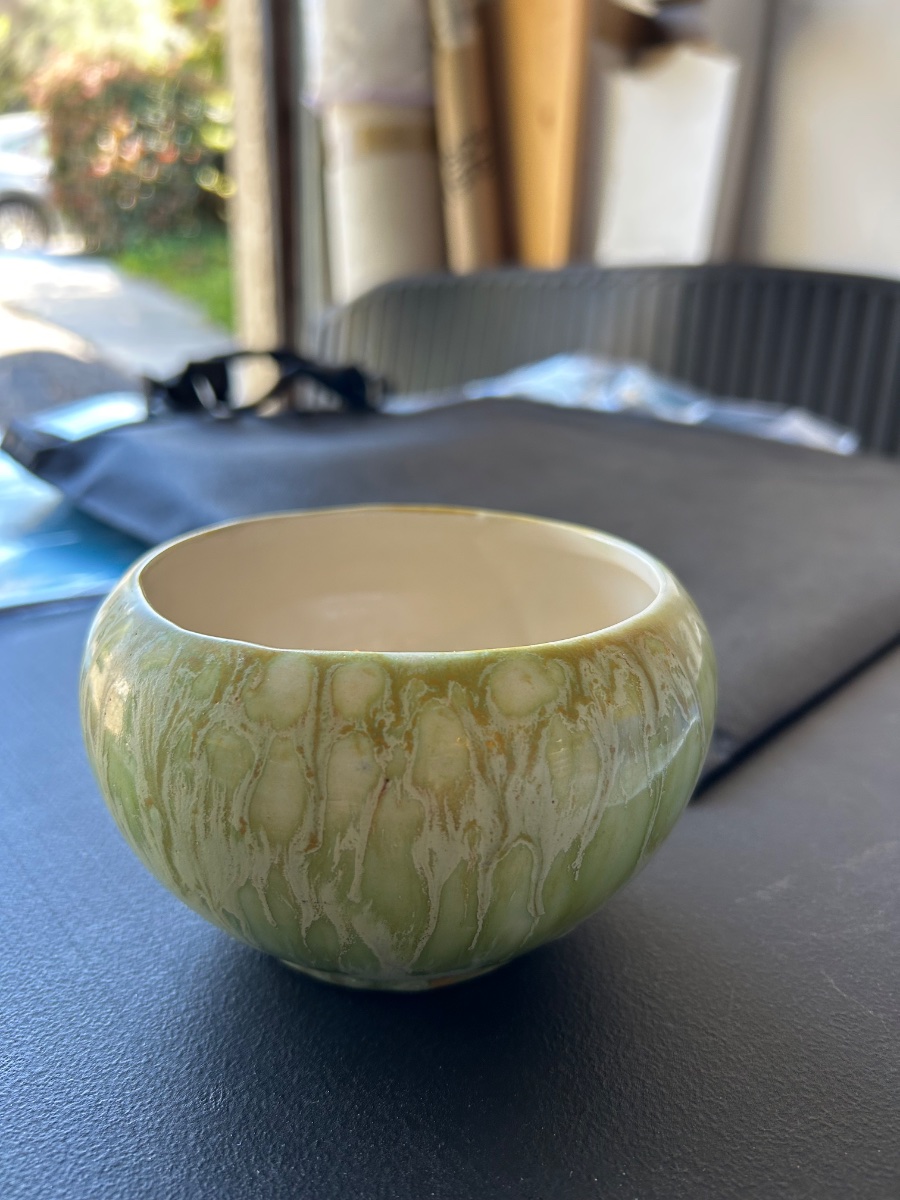 A hand-thrown ceramic bowl featuring a vibrant 'flow' or 'drip' glaze in shades of celadon and moss green over a cream-colored body.