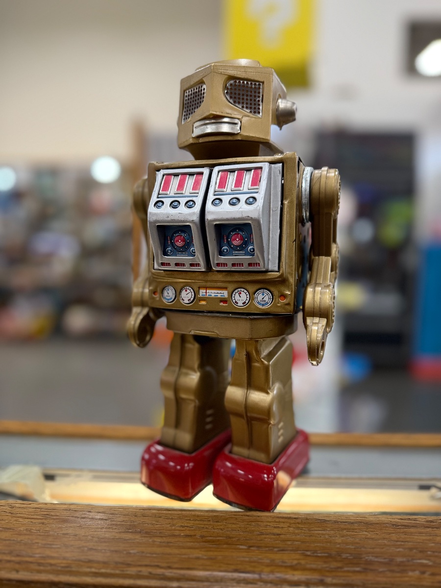 The gold finish appears remarkably clean with very little of the 'shelf wear' or scratching common to tin toys. As a modern reproduction rather than a 1950s original (which can exceed $1,000), value is driven by functional condition and visual appeal.