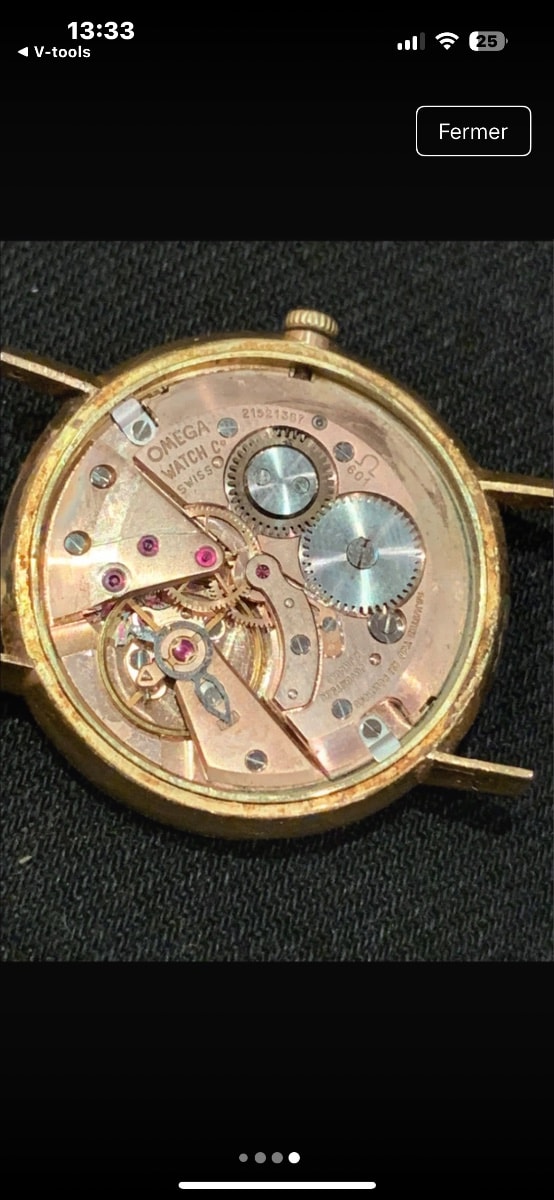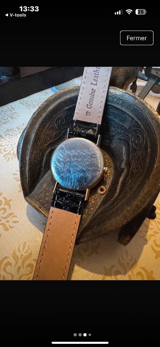 The movement appears remarkably clean and well-preserved, which is the most important factor for functionality. However, the exterior shows heavy 'brassing' where the gold plating has worn away to the base metal, and the case back has significant scratching. The strap is a modern replacement.