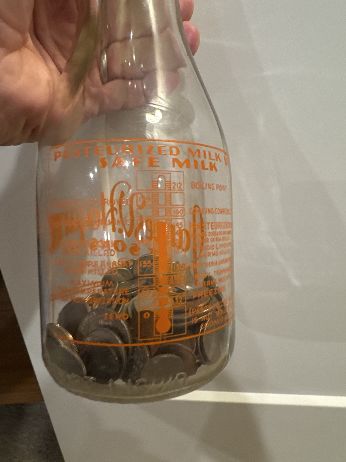 The orange pyroglaze appears remarkably well-preserved with high saturation and very little 'case wear' (the scuffing usually caused by metal crates). Value for dairy bottles is driven by regionality and the condition of the pyroglaze.
