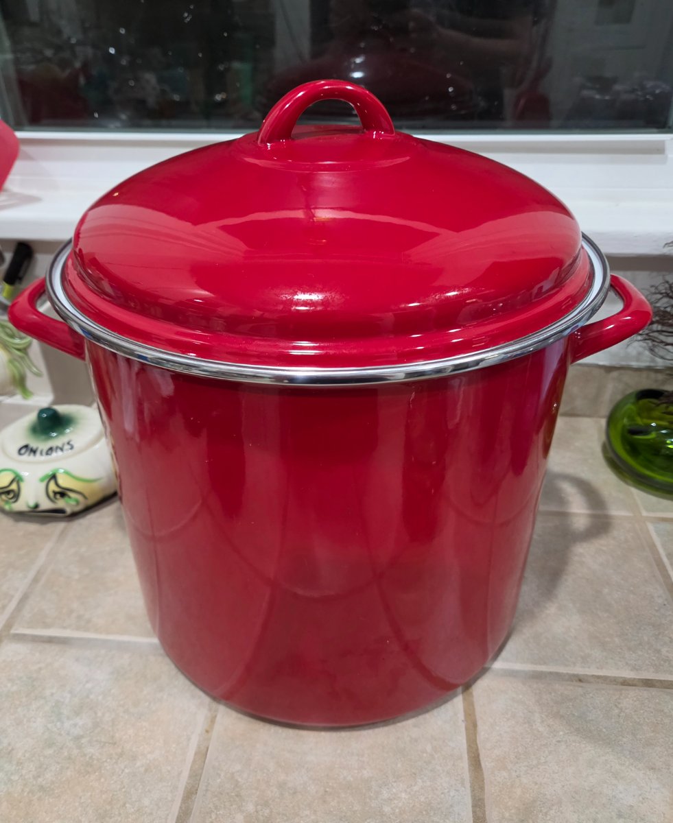 A high-capacity, heavy-gauge carbon steel stockpot finished in a vibrant porcelain enamel.