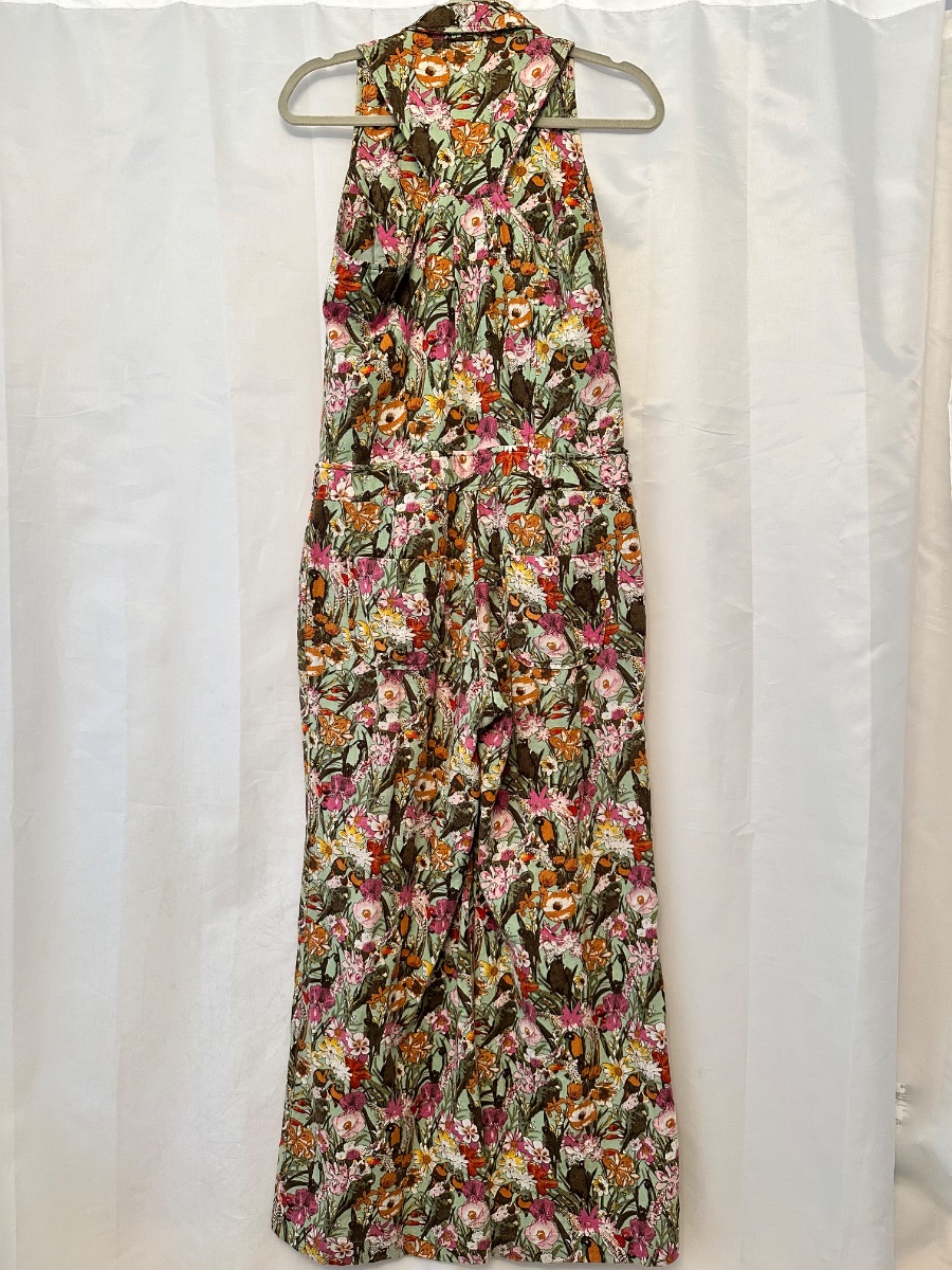 A quintessential piece of 1970s 'hostess' attire, this jumpsuit features a dramatic wide-leg silhouette and a dense, vibrant botanical print.