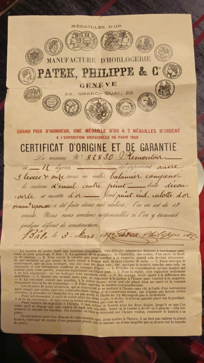 On March 3, 1892, this watch was officially certified at the Patek Philippe workshop on the Grand-Quai in Geneva, just three years after the firm won the Grand Prix at the Paris Universal Exposition.