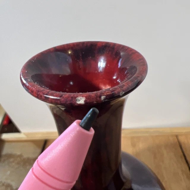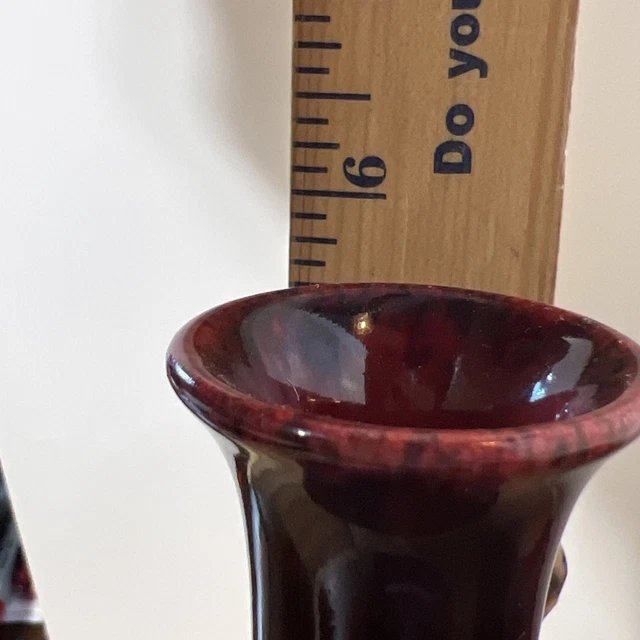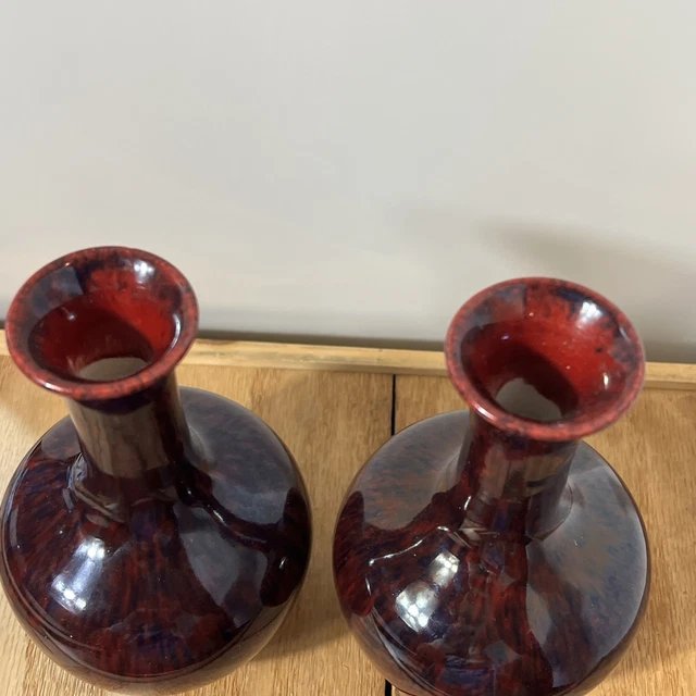 The photos clearly show several small chips on the top rim of the vases, exposing the white porcelain body beneath the red glaze. Pairs are significantly more desirable than single vases in the current market.