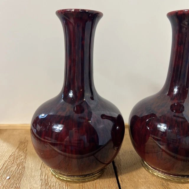 A striking pair of French porcelain vases featuring a rich 'Sang de Boeuf' (oxblood) flammé glaze, mounted on finely chased gilt bronze (ormolu) bases.