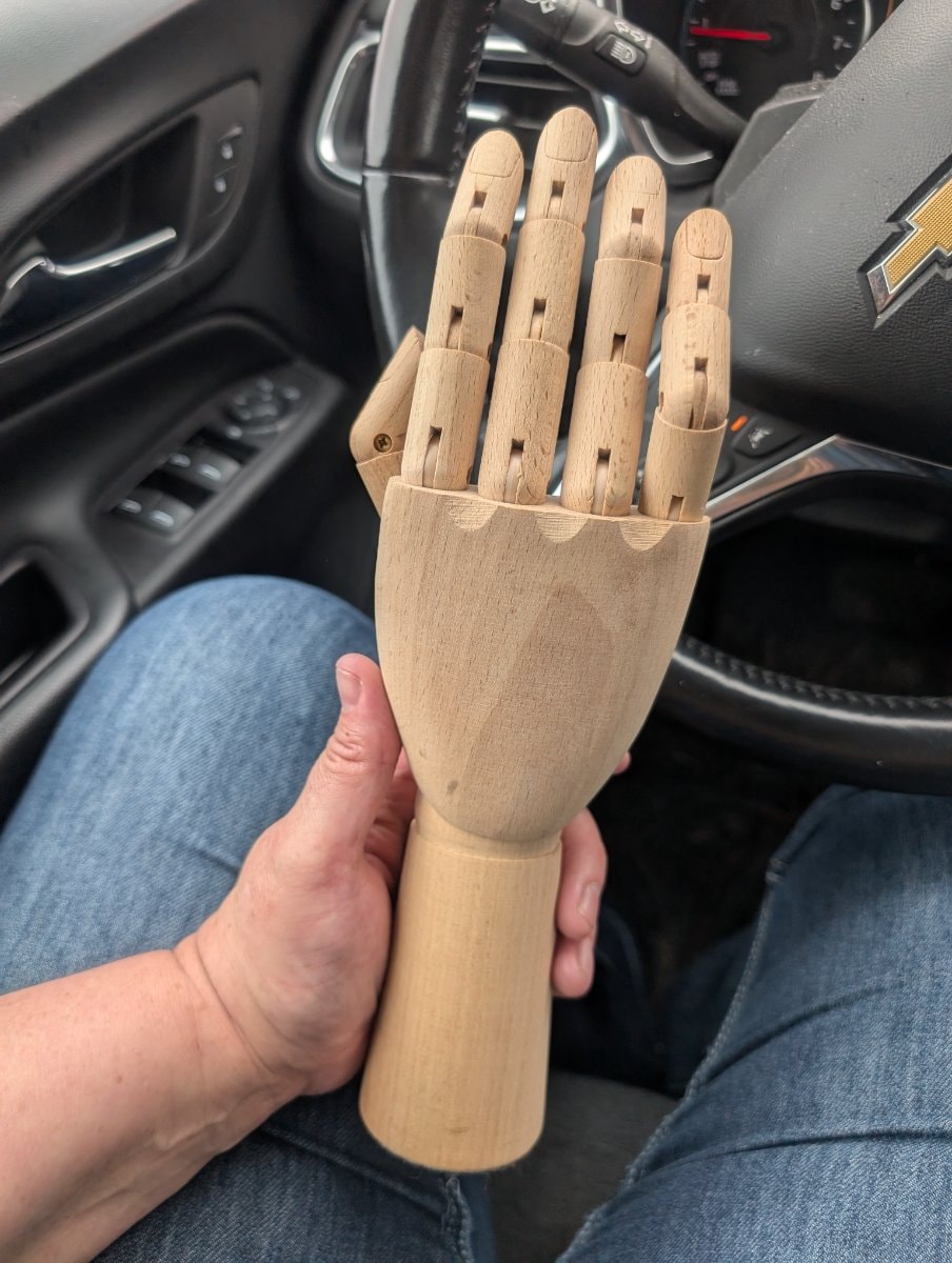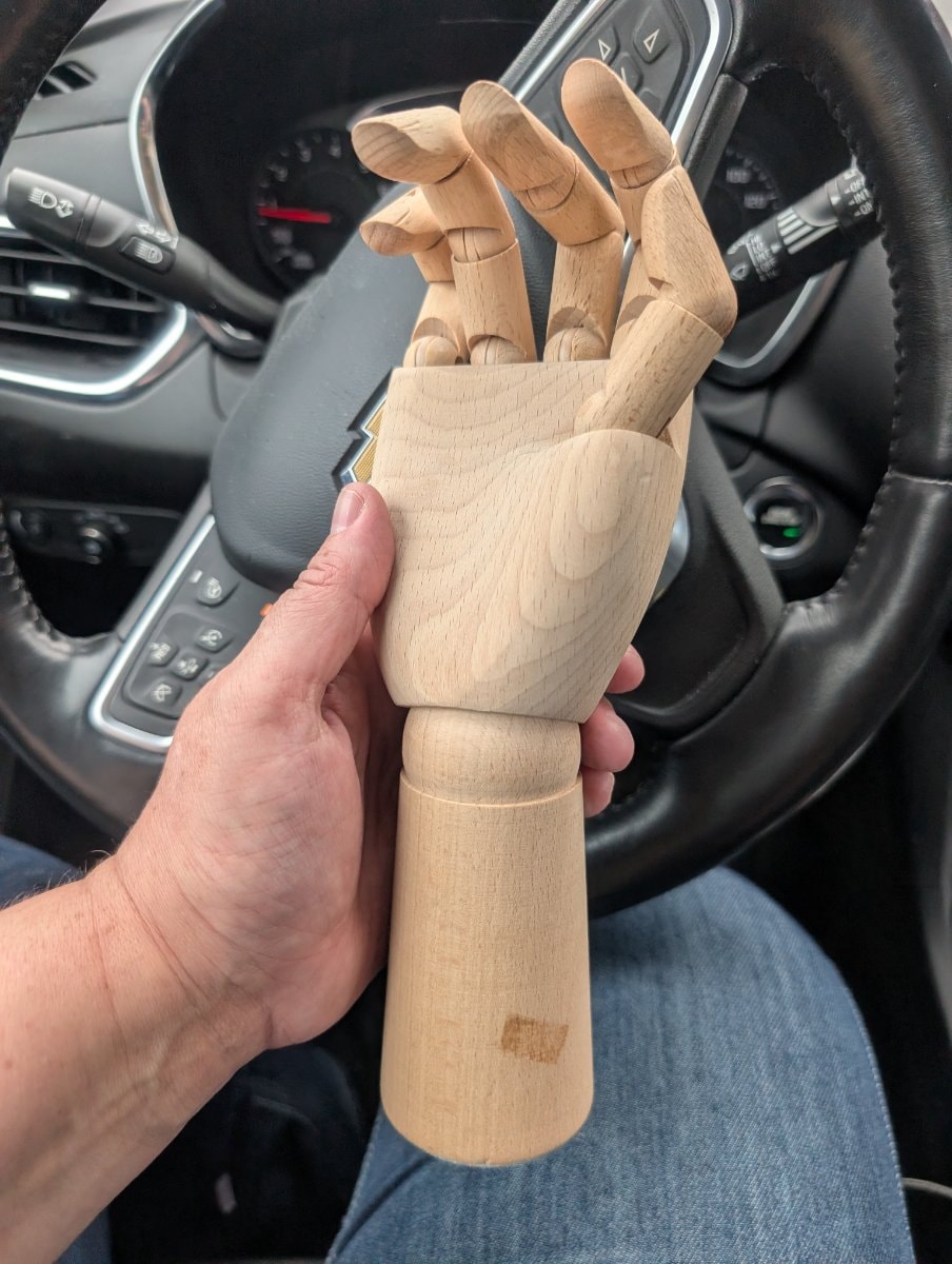 A life-sized, fully articulated wooden hand crafted from beechwood, designed as a reference tool for artists to study human anatomy.