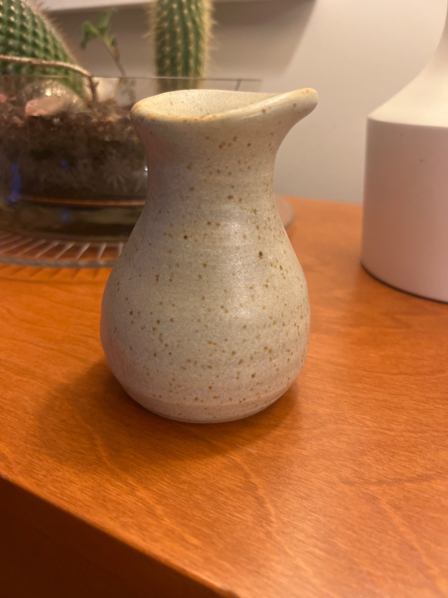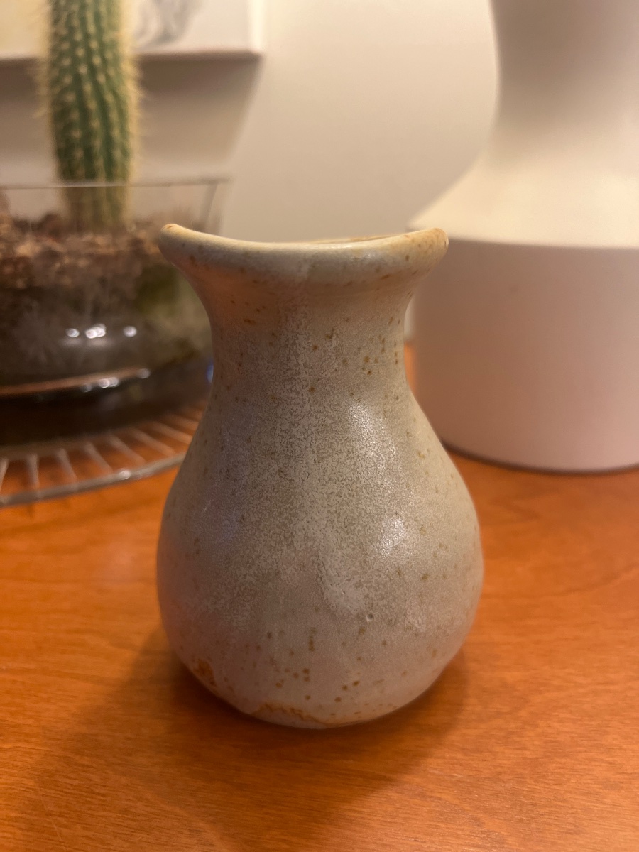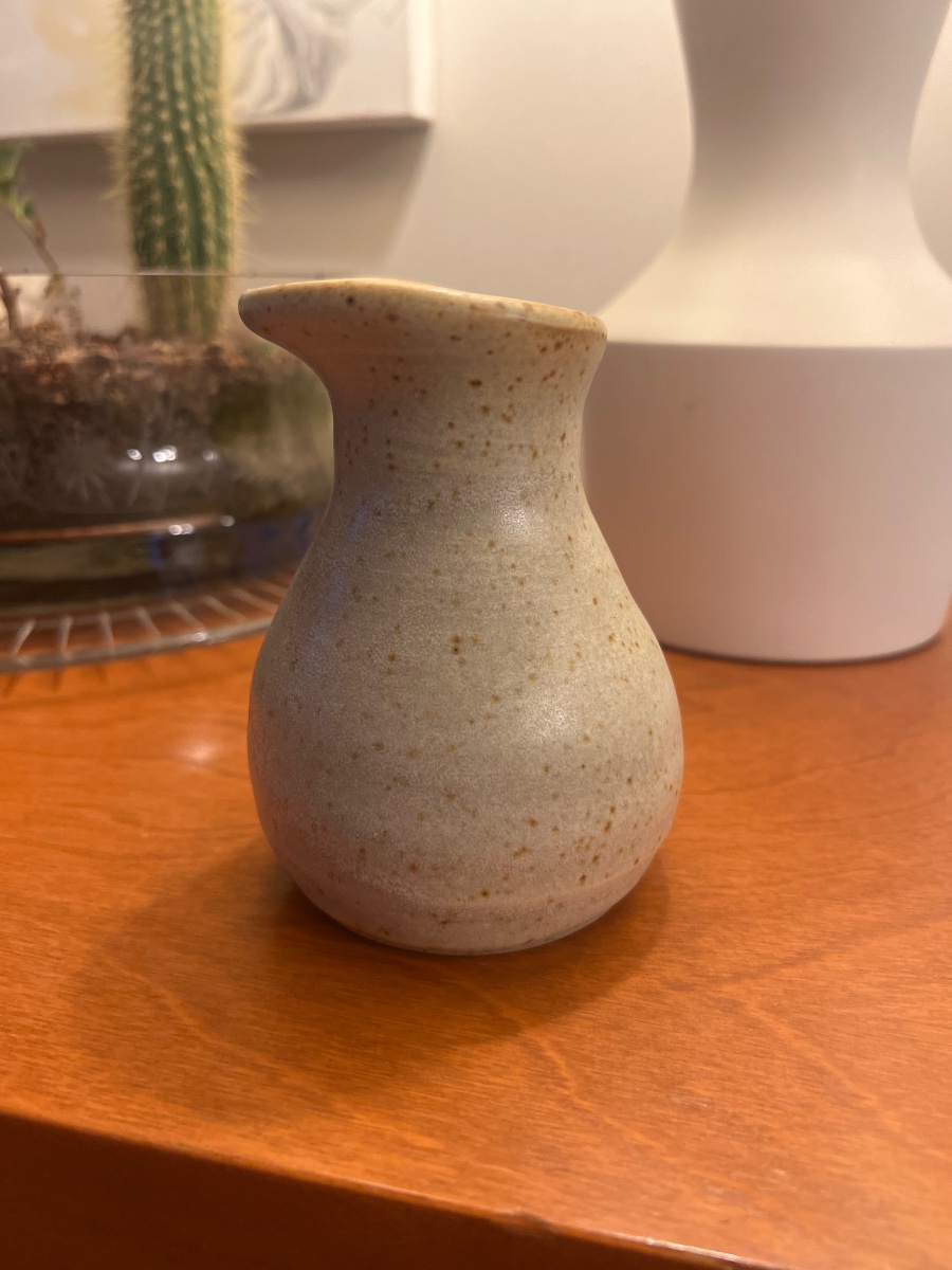 A hand-thrown stoneware vessel featuring a classic bulbous form and a subtle, iron-speckled oatmeal glaze.