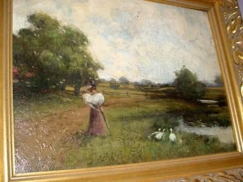 A luminous oil on canvas depicting a pastoral scene of a woman in period dress tending to geese by a stream.